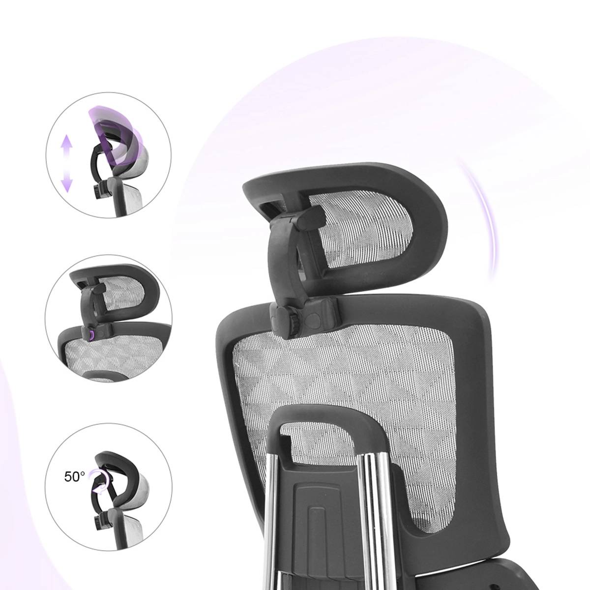 Odpowiednio ustawiony zagłówek na prawidłowej wysokości względem Twojej głowy i szyi. Jest to czynnik, który może zrujnować cały komfort, z doświadczenia jakie będziesz odczuwał podczas siedzenia na krześle - gdy ustawiony źle. Dlatego też fotel biurowy Spacetronik SPC-MIRA daje Ci możliwość dokładnego dopasowania zagłówka do Twojej głowy i szyi. Dzięki mechanizmowi automatycznej blokady masz możliwość ustawienia precyzyjnie jego pozycji. Możesz go swobodnie podnosić, opuszczać, jak i ustawić jego kąt w zakresie do 50°. Wszystko po to, żebyś mógł czerpać jak największą przyjemność ze wszystkich chwil, gdy będziesz na nim siedział.