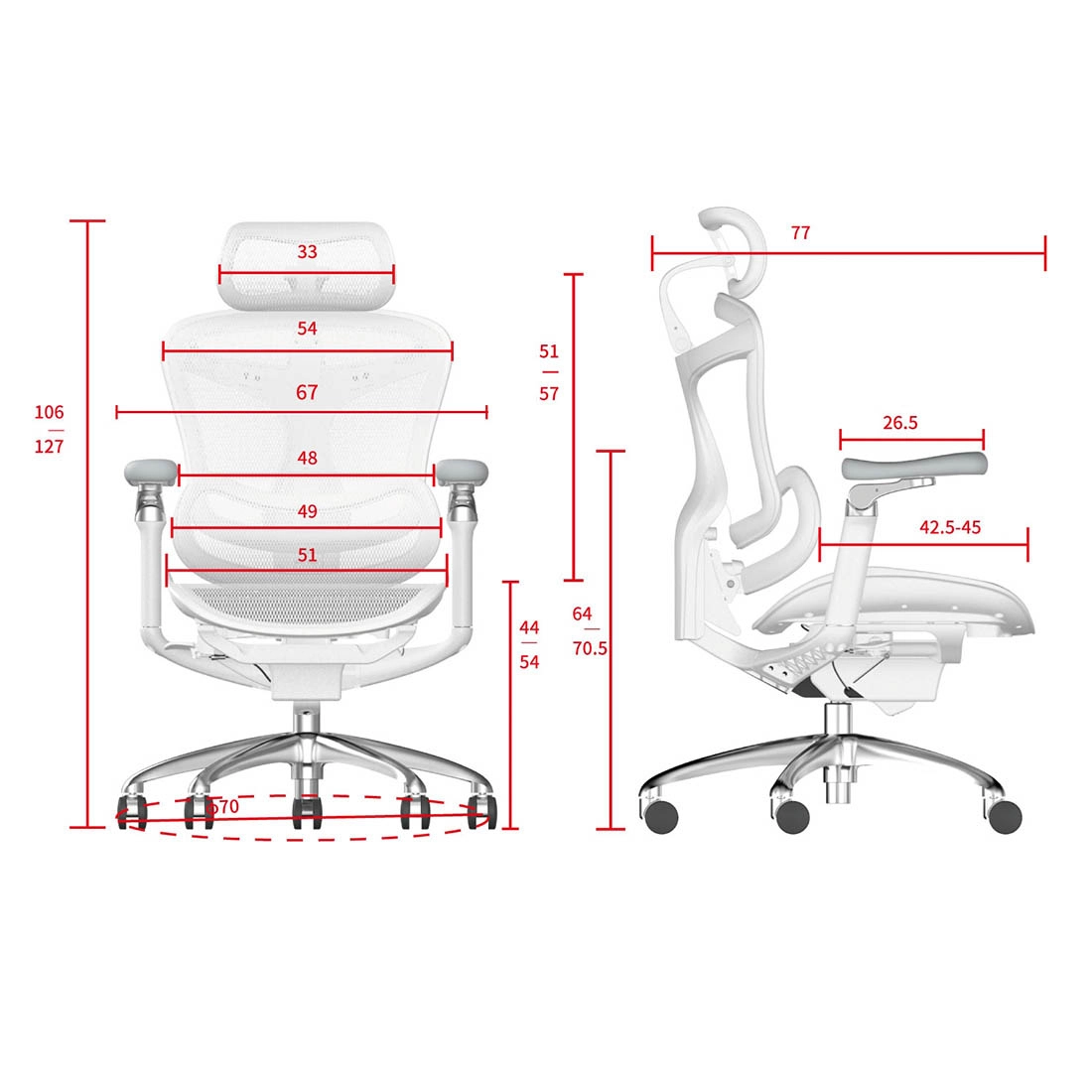 Krzesła i fotele do biura potrafią znacząco się od siebie różnić. Mimo że z wyglądu są podobne, ich funkcjonalność może być odrobinę inna. Za pomocą jednej dźwigni znajdującej się pod siedzeniem jesteś w stanie regulować zarówno wysokość, jak i pochył fotela biurowego. Jesteś w stanie bardzo szybko i prosto dopasować krzesło do swoich potrzeb, bez potrzeby wstawania z niego. Jego wysokość możesz regulować w zakresie 106 - 127 cm. Natomiast pochył odbywa się w zakresie 105° - 135°.
