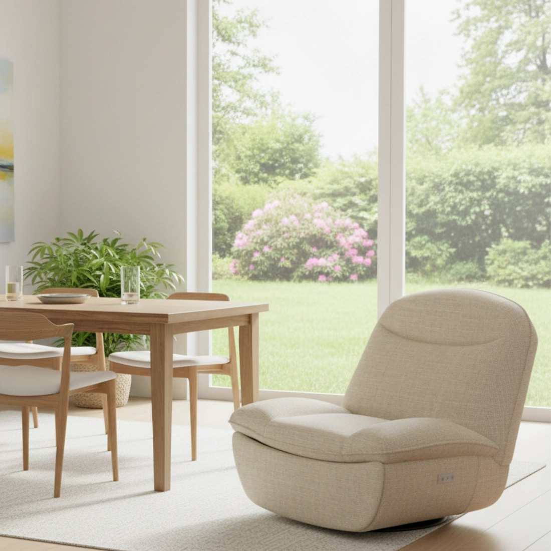 FLAX 05 w kolorze beżowym tworzy prywatną strefę relaksu – do oglądania filmów, czytania, drzemki czy regeneracji po pracy. Jednym przyciskiem przejdziesz z pozycji siedzącej do leżącej, a dzięki wbudowanym portom USB naładujesz telefon lub tablet, nie wstając z miejsca. Neutralny, beżowy odcień łatwo dopasujesz do salonu, sypialni lub pokoju wypoczynkowego.