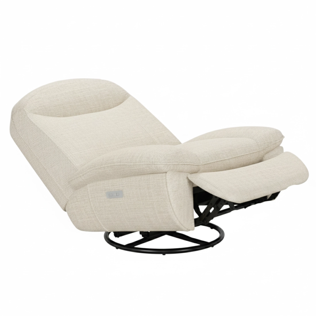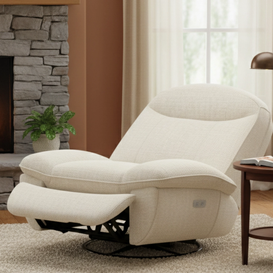 Panel sterowania został dyskretnie wkomponowany w podłokietnik fotela, aby zawsze był w zasięgu dłoni. Dwa intuicyjne przyciski umożliwiają płynne i jednoczesne rozkładanie oparcia oraz podnóżka do pozycji leżącej, a następnie ich złożenie do pozycji siedzącej. Zintegrowane porty USB-A oraz USB-C o mocy 10 W pozwalają wygodnie ładować urządzenia mobilne – telefon, tablet czy słuchawki – bez potrzeby podnoszenia się z fotela.