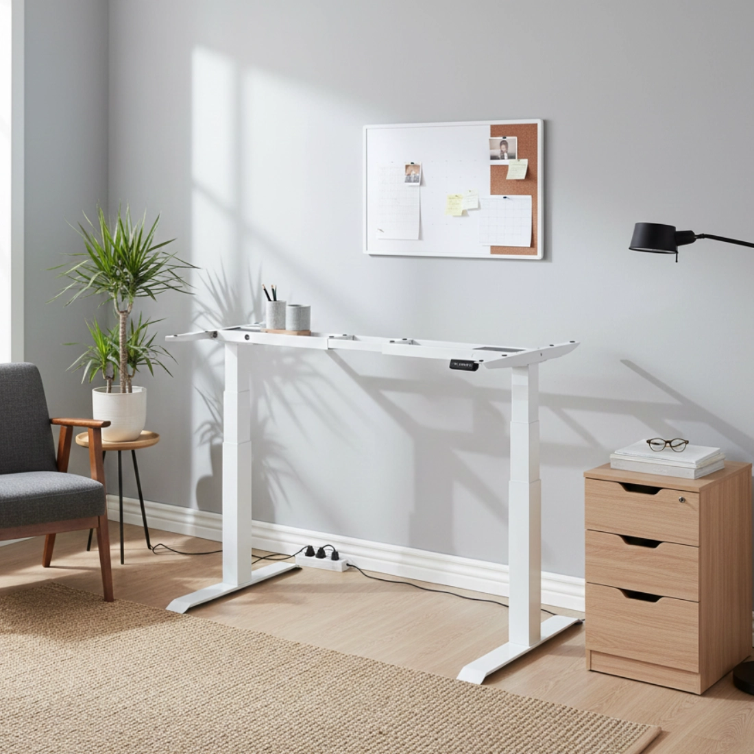 Dwusilnikowa konstrukcja zapewnia stabilną pracę nawet wtedy, gdy na blacie stoi pełny setup: monitor/monitory, laptop, głośniki, mikrofon i akcesoria. Ruch jest płynny, a biurko zachowuje pewność na każdej wysokości – bez irytujących drgań.
