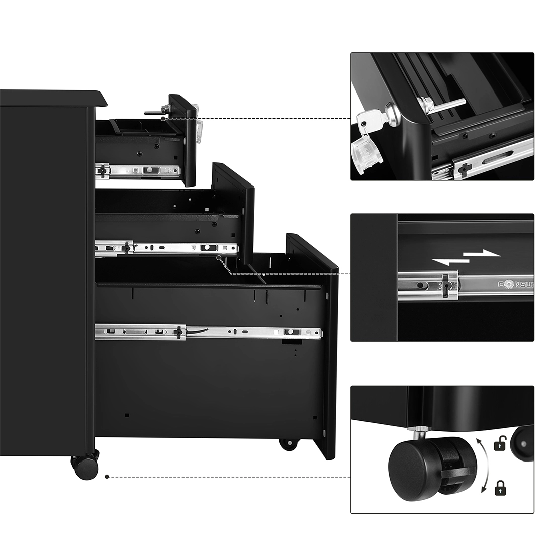 - szafka: Spacetronik SPC150B, stal malowana proszkowo, 3 szuflady na dokumenty (A4/Letter/Legal/F4), zamek na klucz, kółka z blokadą
