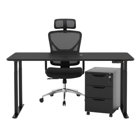 Zestaw do nowoczesnego biura: biurko elektryczne (stelaż SPE426B + blat MDF Pure Black) + fotel ergonomiczny SPC-NERO + szafka podbiurkowa SPC150B