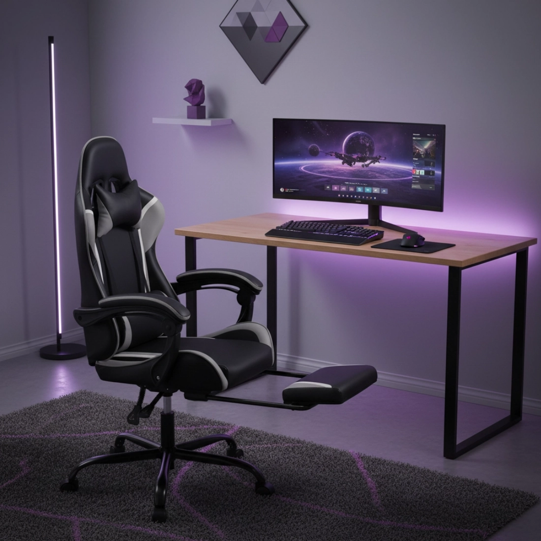 Wysuwany podnóżek ułatwia odpoczynek, a poduszka pod lędźwie i kark wspiera newralgiczne odcinki kręgosłupa. Regulacja wysokości i możliwość ustawienia oparcia pomagają dopasować pozycję do pracy przy biurku oraz do dłuższych sesji gamingowych.