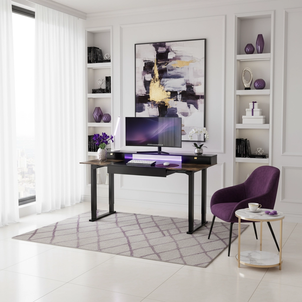 Kompletne stanowisko pracy 3w1 – elektryczne biurko z szufladami, krzesło ergonomiczne 4D i profesjonalna lampa kreślarska w jednym spójnym zestawie.