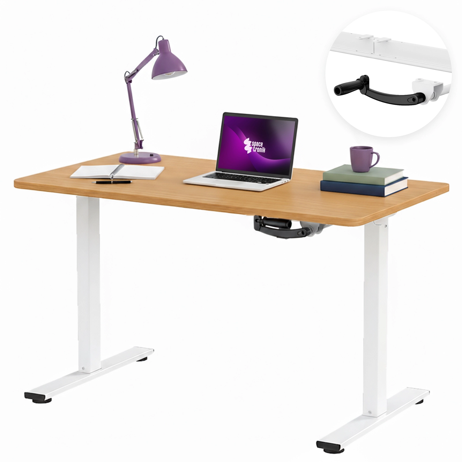 Wysokość biurka regulowana jest manualnie za pomocą korbki w zakresie od 72 cm do 110 cm, co pozwala na płynną zmianę pozycji z siedzącej na stojącą.