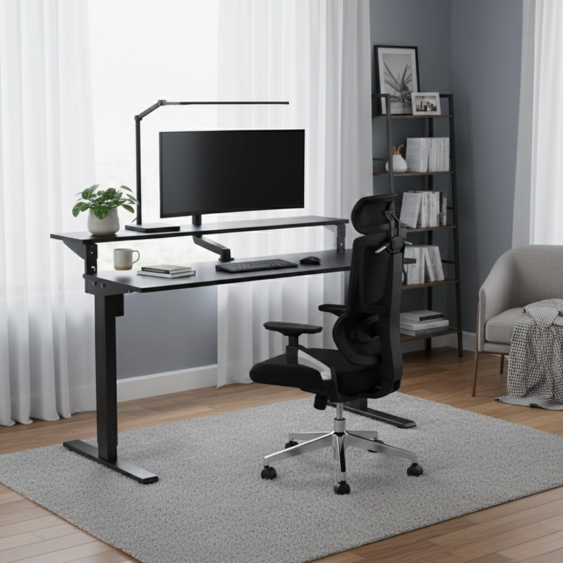 Elektryczny stelaż biurka Moris SPE-O133BB umożliwia szybką zmianę wysokości blatu, dzięki czemu w kilka sekund przechodzisz z pozycji siedzącej do stojącej. Dwa blaty pozwalają stworzyć jedną dużą powierzchnię roboczą lub dwie osobne strefy – idealne do pracy z dzieckiem, partnerem lub podczas łączenia pracy biurowej z kreatywnymi projektami.