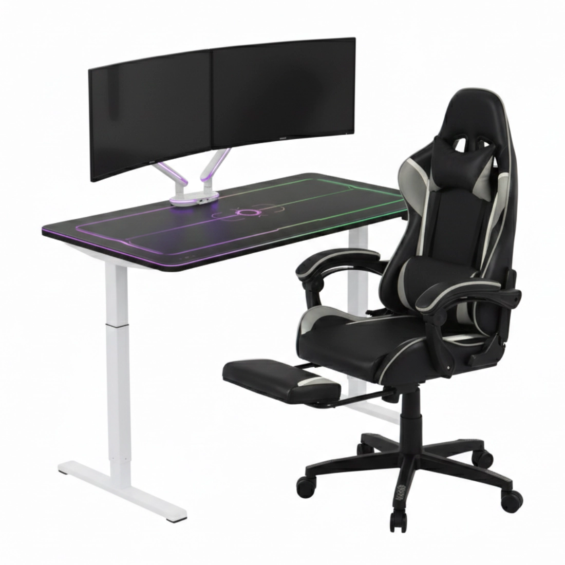 Zbuduj kompletne stanowisko do gry i pracy w jednym kroku. Zestaw łączy gamingowe biurko elektryczne z podświetleniem RGB, podwójne ramię do monitora SPAF120LUW oraz wygodny fotel gamingowo-biurowy Spacetronik Rally z podnóżkiem. Efekt to ergonomia na co dzień, czysty blat bez chaosu kabli i klimat prawdziwego setupu – gotowy do streamu, nauki i wielogodzinnych sesji.