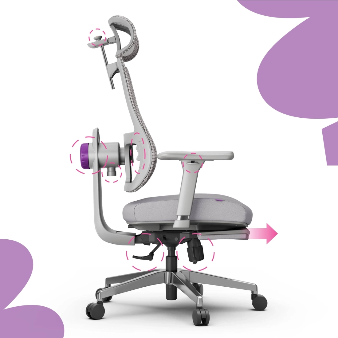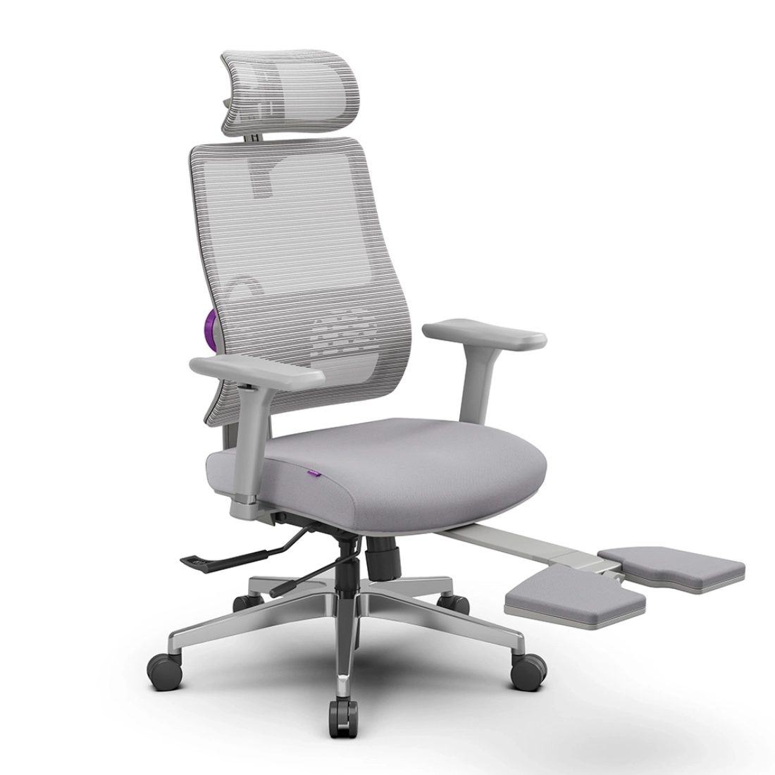 - Podłokietniki 4D – regulacja w czterech płaszczyznach (góra/dół, przód/tył, skręt i przesunięcie), by zapewnić naturalne ułożenie rąk.