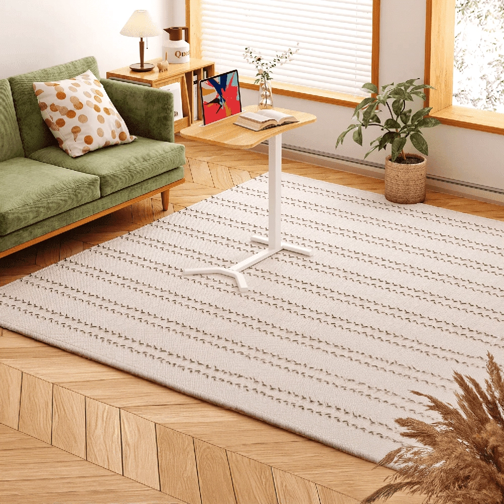 Udźwig do 7 kg, połączenie płyty wiórowej, melaminy, stali i tworzywa. Biały stelaż i jasno drewniany blat — estetyka, która pasuje do nowoczesnych wnętrz.