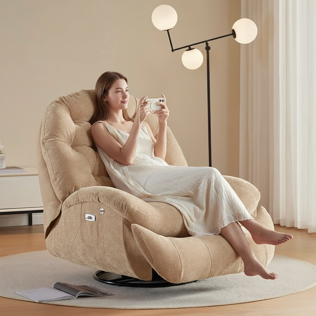 Synchroniczne rozkładanie oparcia i podnóżka, delikatna kołyska (Glider), ładowanie USB-C oraz uchwyt i kieszeń na akcesoria w zasięgu dłoni. Beżowa tapicerka łatwo wpasuje się w jasne, ciepłe wnętrza.