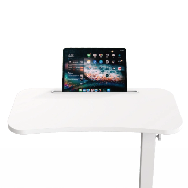 Regulacja wysokości 665–1065 mm za pomocą sprężyny gazowej, blat 600×380 mm oraz szczelina na telefon/tablet. Konstrukcja „C” umożliwia wygodny wjazd nad łóżko lub fotel.