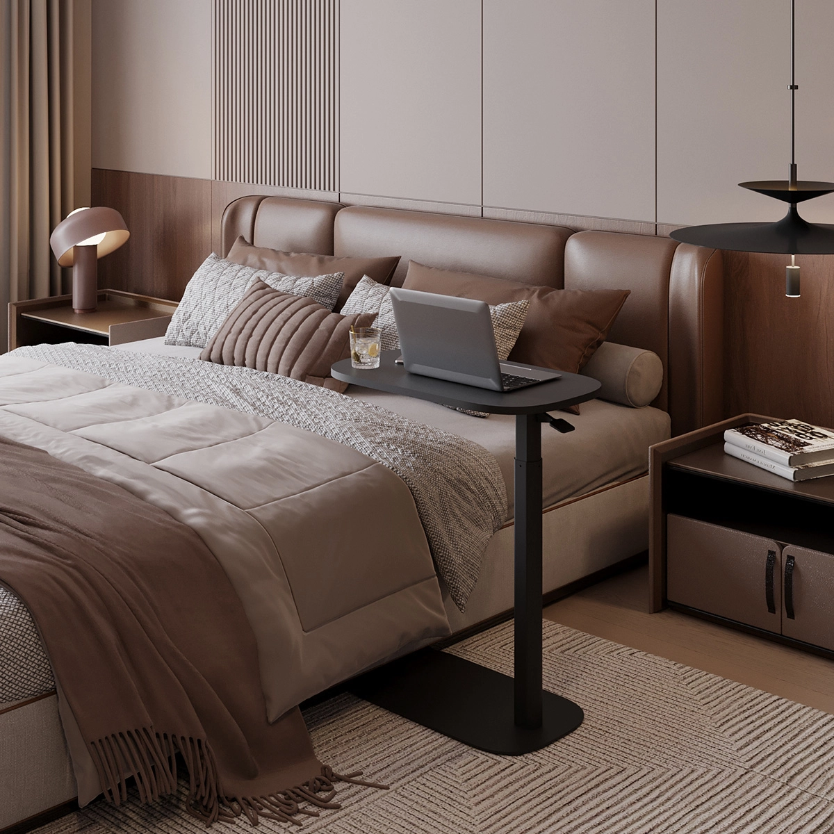 Gazowa regulacja 645–1045 mm i płaska podstawa ułatwiają ustawienie stolika nad łóżkiem lub kanapą. Blat 600×350 mm pomieści laptop, książkę i kubek.