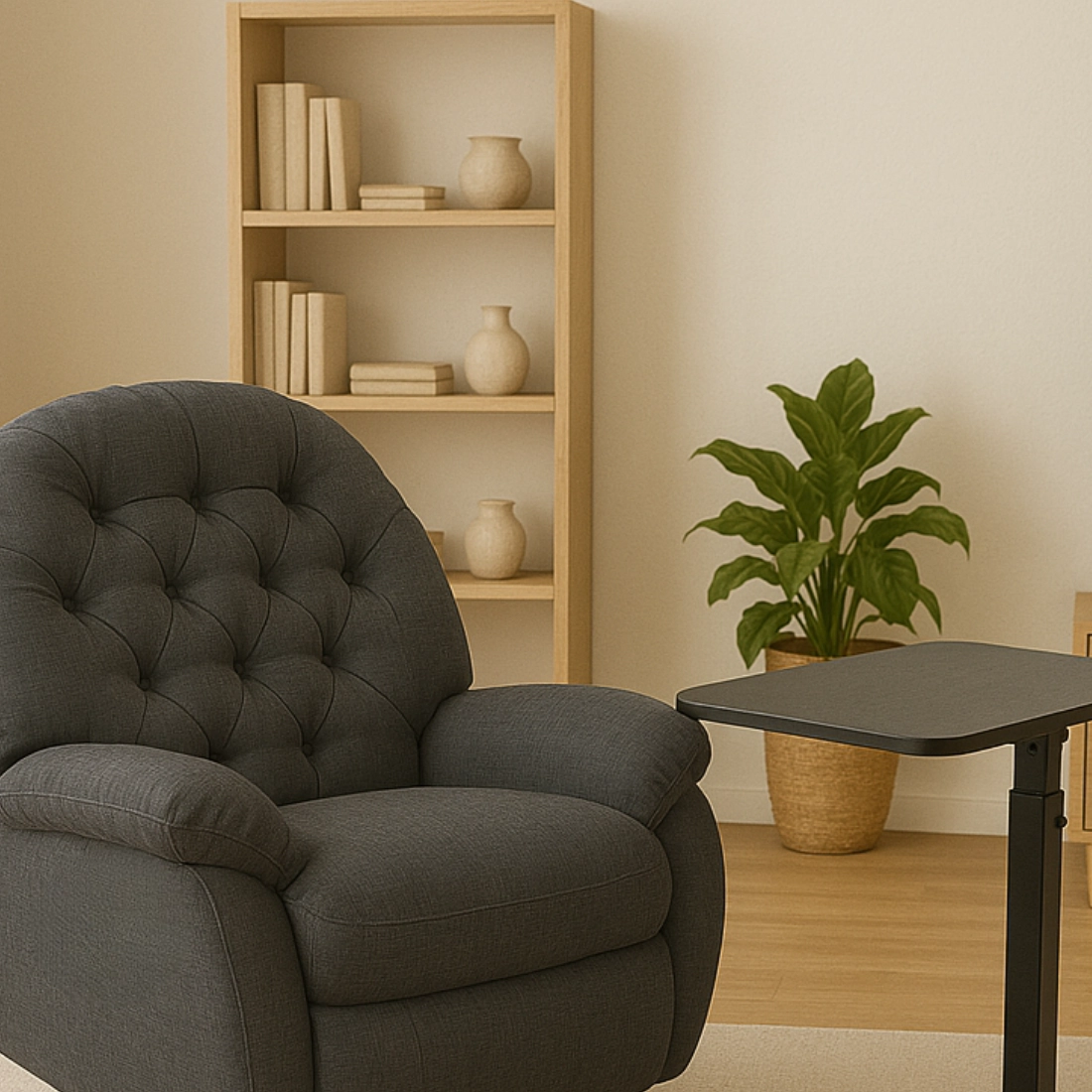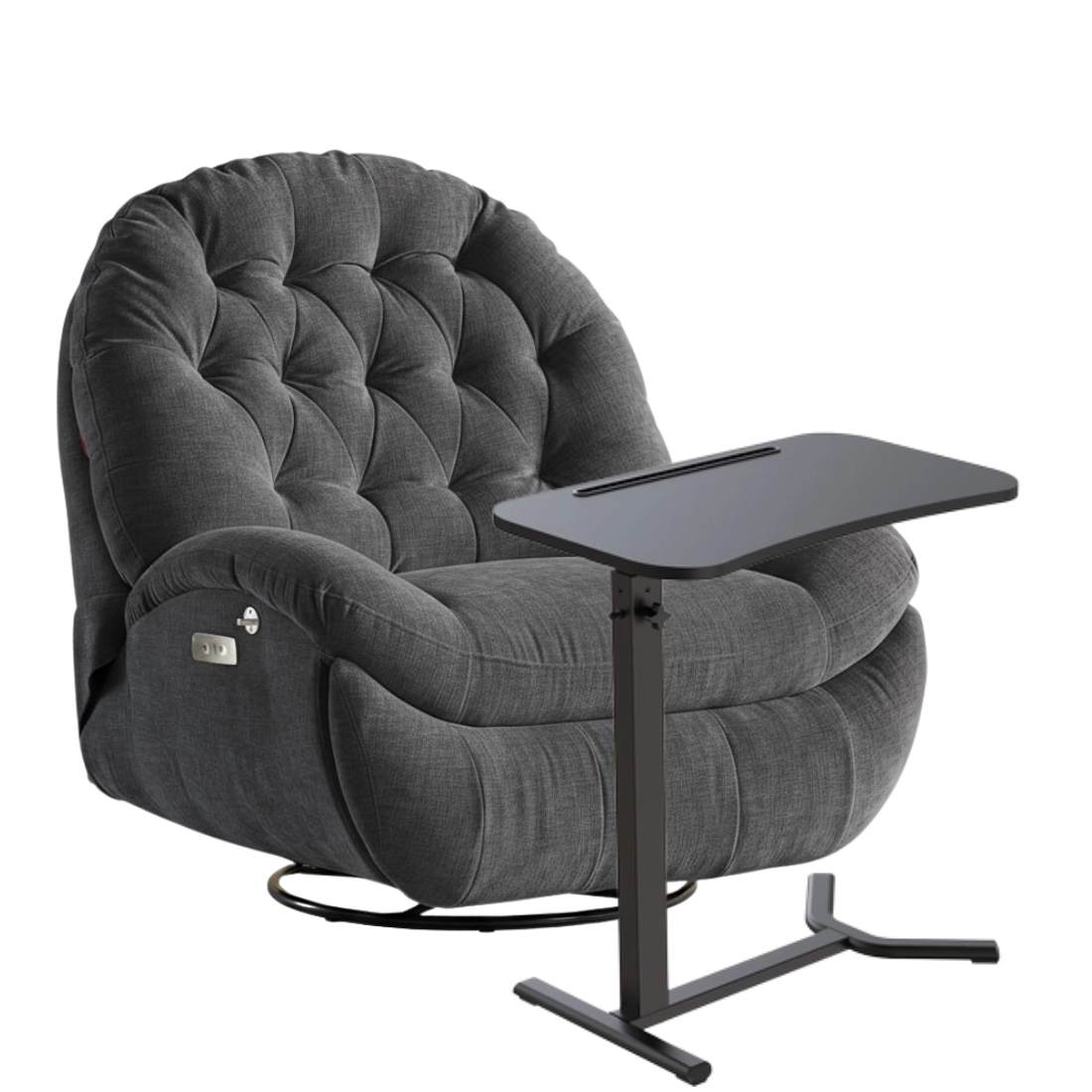 Komfortowy duet do relaksu i pracy: szary fotel Flax 04 z elektryczną regulacją oparcia i podnóżka (sterowanie ROZŁÓŻ/ZŁÓŻ), kołyską Glider, uchwytem na telefon i gniazdem USB-C oraz stolik BUDDY 19 w kolorze czarnym — z 5-stopniową manualną regulacją wysokości i blatem 60×38 cm. Wszystko w zasięgu ręki.