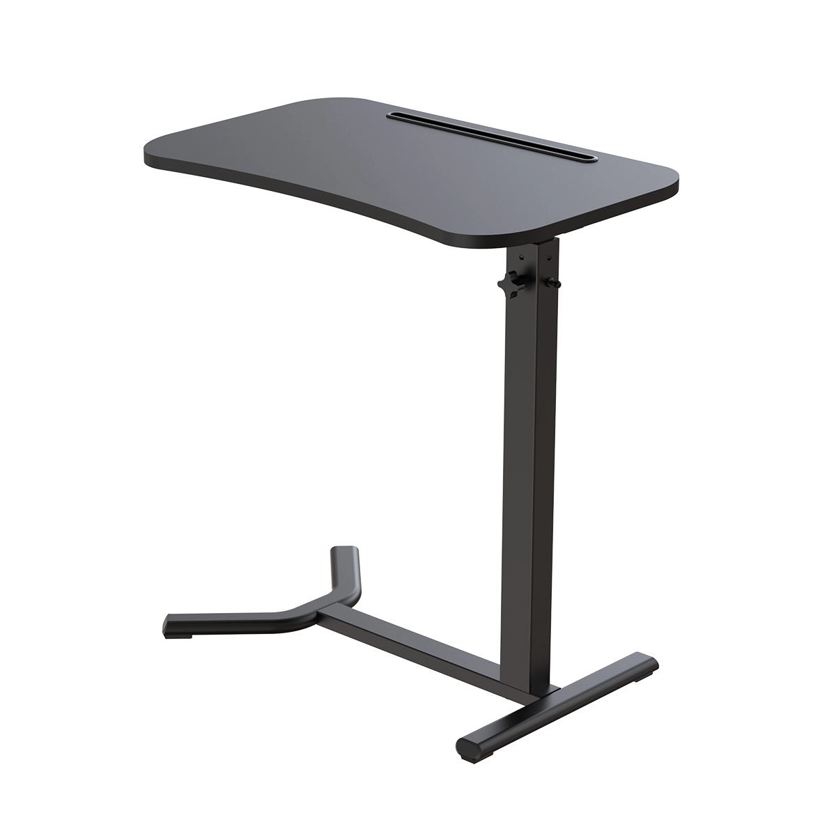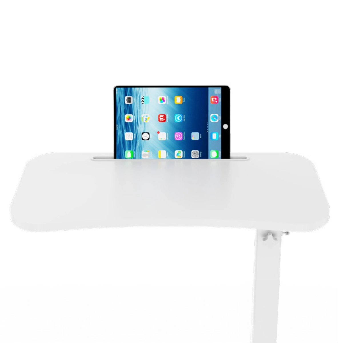 Powierzchnia 60×38 cm wygodnie mieści laptopa i notatki, a rynna porządkuje telefon/tablet. Stabilna stopa łatwo wsunie się pod meble, by blat znalazł się dokładnie tam, gdzie potrzebujesz.