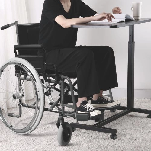 Dźwigniowa regulacja wysokości 71–110 cm, blat 760×390×18 mm, cztery ciche kółka z blokadą. Konstrukcja „C” pozwala wjechać nad łóżko lub wsunąć się pod fotel.