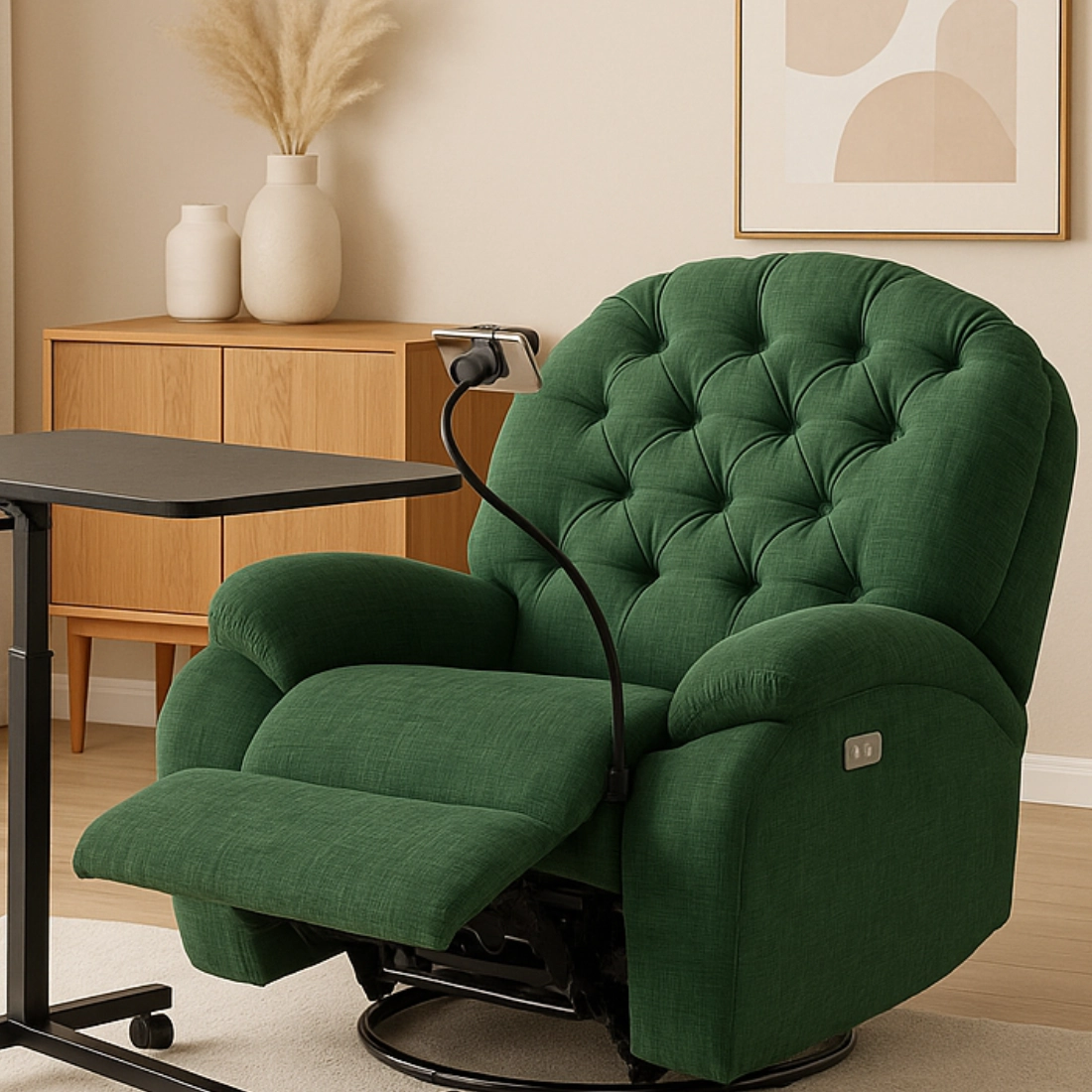 Elektryczne sterowanie fotela pozwala zatrzymać ruch w dowolnym momencie i precyzyjnie dobrać kąt. Stolik z konstrukcją „C” i kółkami szybko zmieni miejsce pracy lub relaksu — od sypialni po salon.