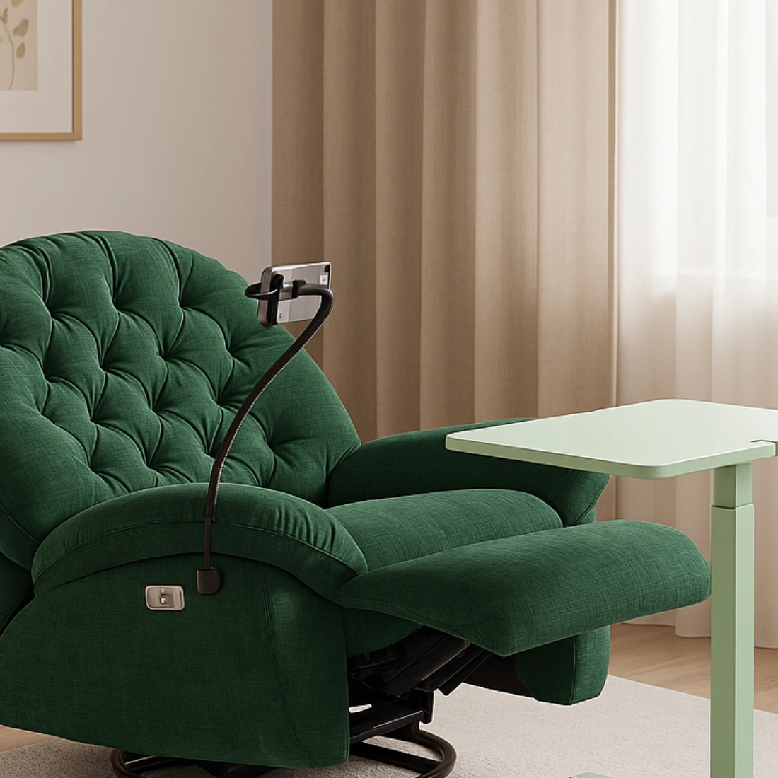 Domowa oaza relaksu i pracy: fotel Spacetronik Flax 04 z elektryczną regulacją (ROZŁÓŻ/ZŁÓŻ), funkcją kołyski (glider), uchwytem na telefon i ładowarką USB-C oraz mobilny stolik pomocniczy Spacetronik BUDDY 15-GJJ z dwoma blatami i płynną regulacją wysokości 755–1108 mm. Komfort, funkcjonalność i porządek w zasięgu ręki.