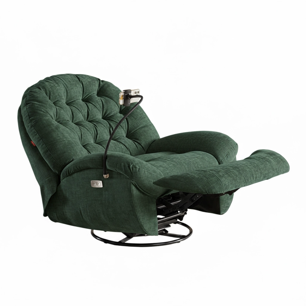 Synchroniczne rozkładanie oparcia i podnóżka za pomocą dwóch przycisków ROZŁÓŻ/ZŁÓŻ. Kołyska (glider) koi, a port USB-C doładuje telefon bez wstawania. Miękkie pikowania i pianka 30 kg/m³ otulają ciało.