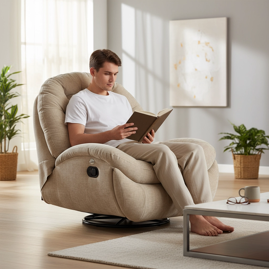 Manualna regulacja oparcia i podnóżka + kołyska (Glider) + obrót 360° (Swivel) — pełna kontrola pozycji.