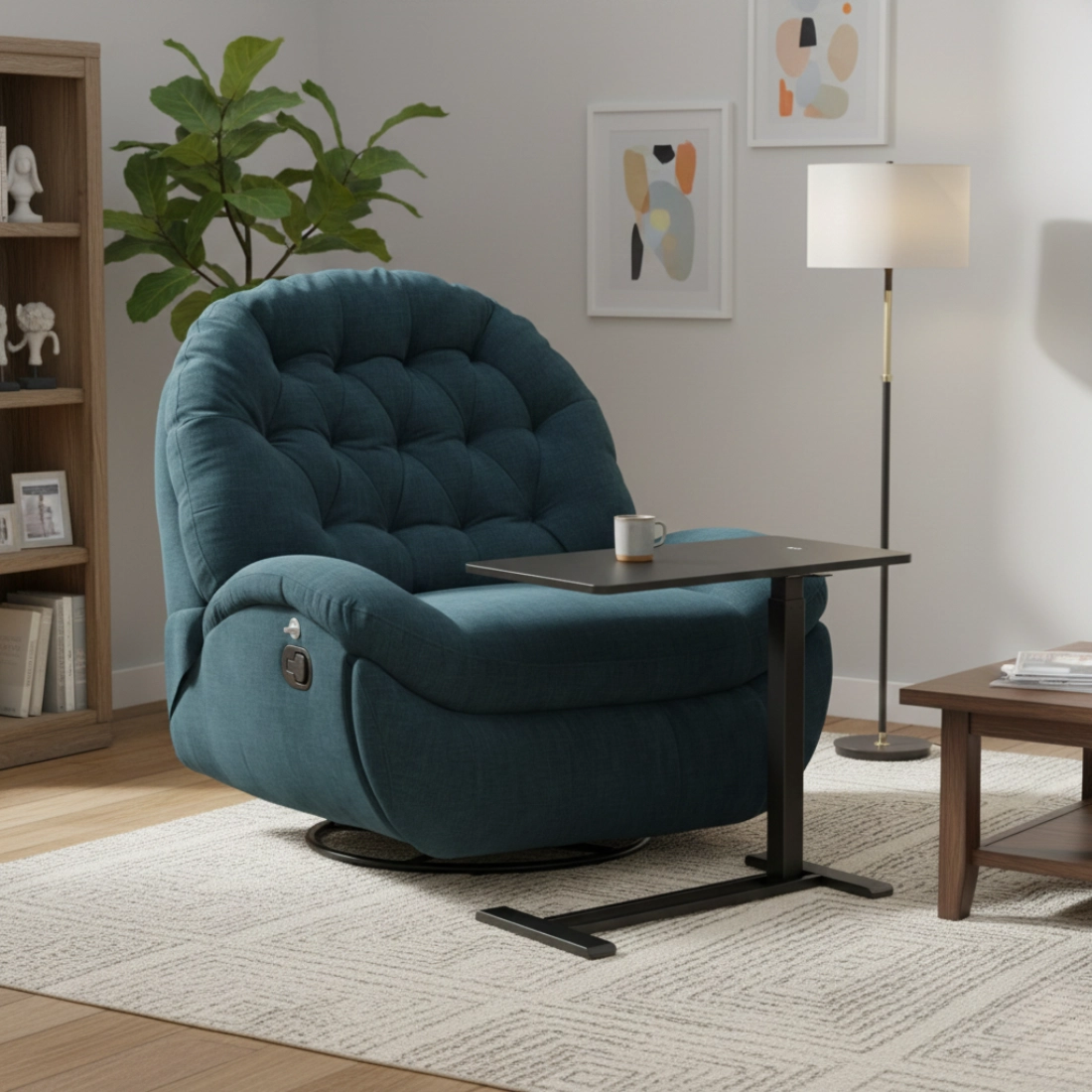 Komfortowy relaks i praktyczna przestrzeń obok fotela: Spacetronik Flax 04M z kołyską (Glider), obrotem 360° (Swivel), manualną regulacją oparcia i podnóżka (Balans+) oraz uchwytem na telefon, a także mobilny stolik BUDDY 07 z blatem 700×400 mm, sprężyną gazową (660–1060 mm) i ukrytymi kółkami.