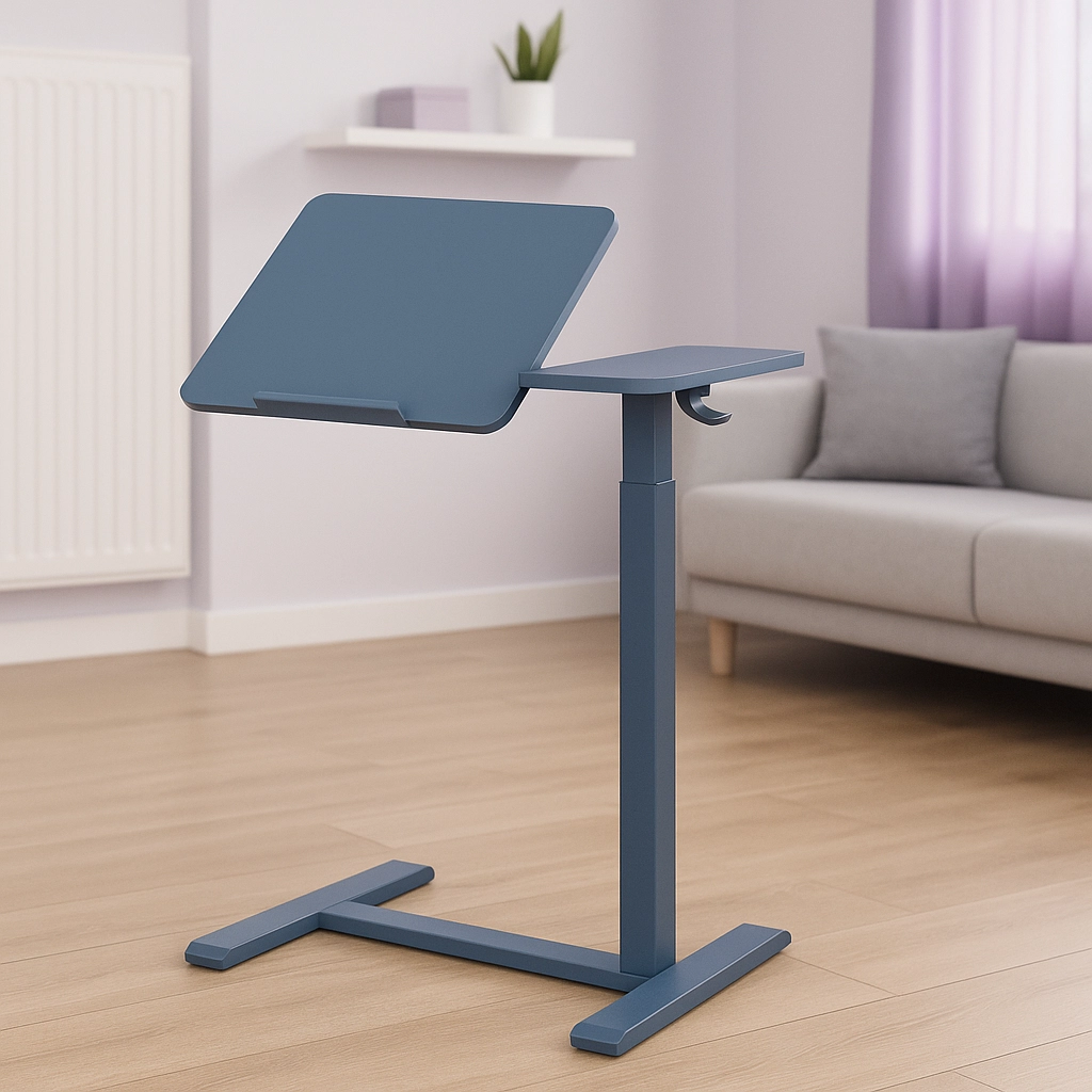 Większy blat z regulacją kąta i podpórką przeciw zsuwaniu oraz mniejszy stały na kawę, myszkę lub notatki. Gazowa regulacja 755–1108 mm i kompaktowa konstrukcja ułatwiają pracę w salonie, sypialni czy na tarasie.