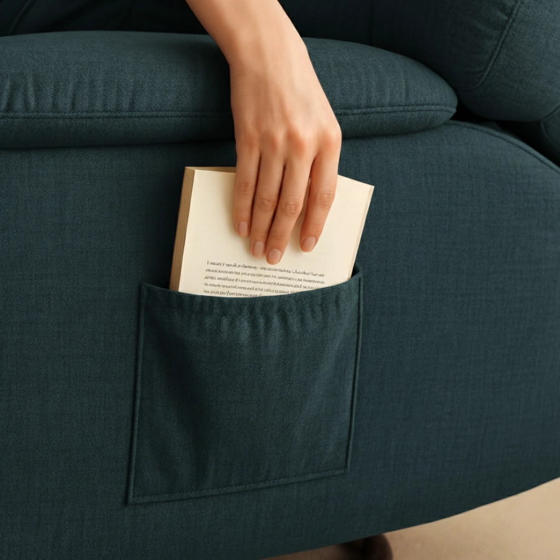 Grube pikowania + pianka 30 kg/m³, szenilowa tapicerka przyjemna w dotyku, uchwyt na telefon i kieszeń boczna — komfort i funkcjonalność.