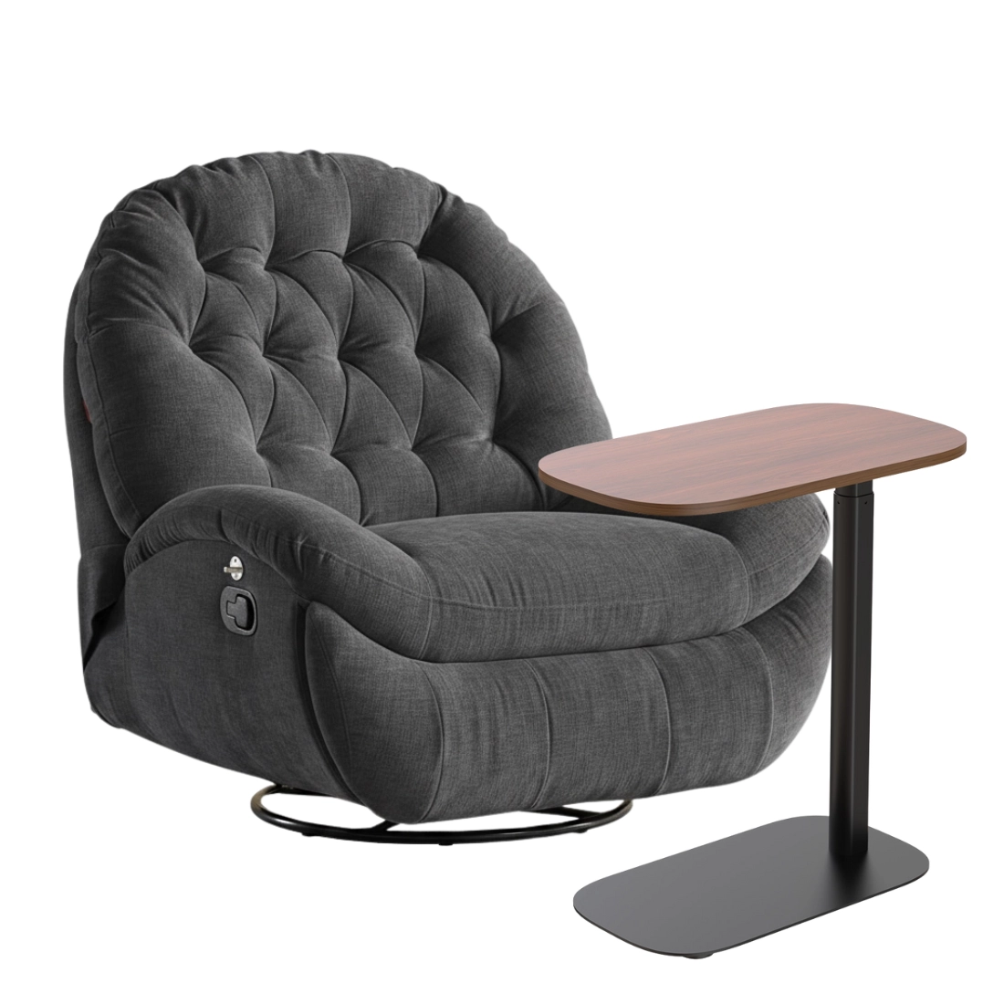 Komplet do relaksu i pracy w domu. FLAX 04M zapewnia kołyskę (Glider), pełny obrót 360° (Swivel) oraz manualną regulację oparcia i podnóżka. BUDDY 17 to lekki, regulowany stolik z podnośnikiem gazowym, płaską stabilną podstawą i blatem w kolorze ciemnego drewna — idealny pod laptop, książkę i kawę.