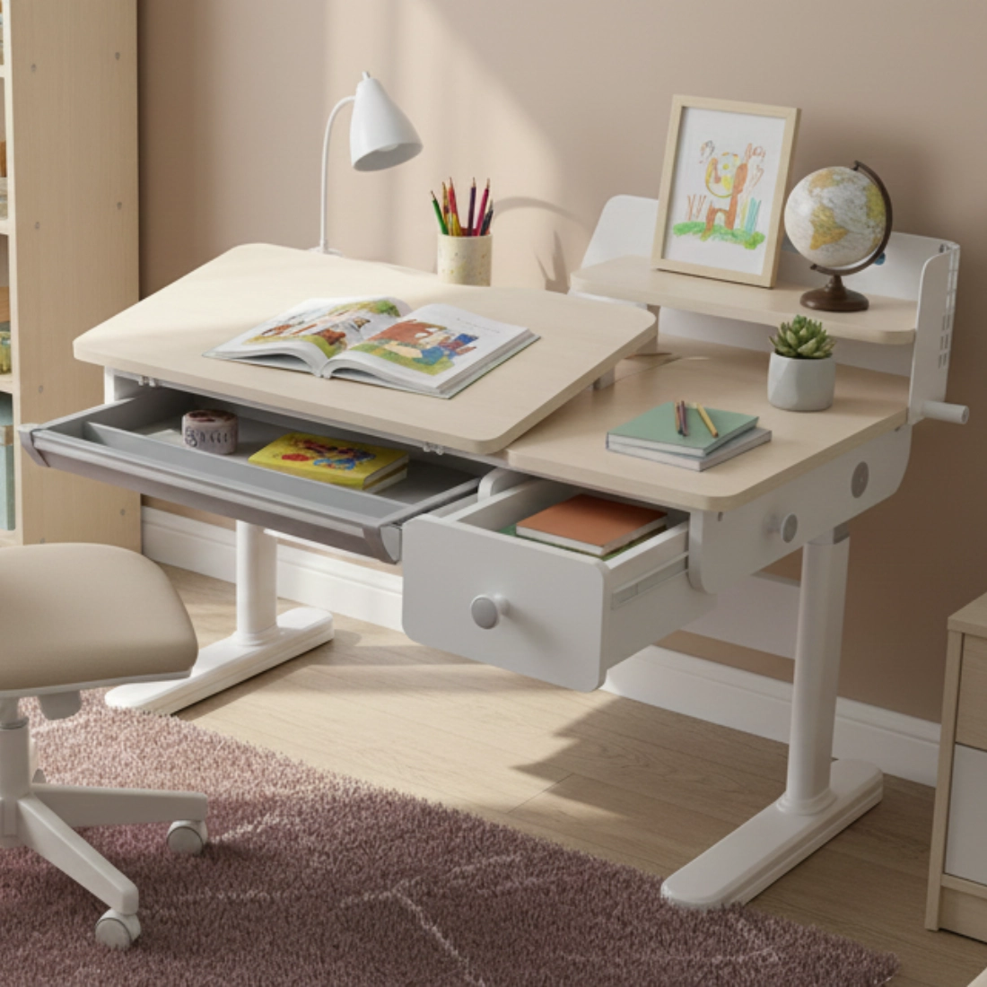Biała konstrukcja w połączeniu z blatem w kolorze drewna wygląda lekko i pasuje do większości pokojów dziecięcych. Praktyczne elementy organizacyjne — szuflady oraz półka zamocowana do blatu — pomagają utrzymać porządek i szybciej znaleźć potrzebne rzeczy.