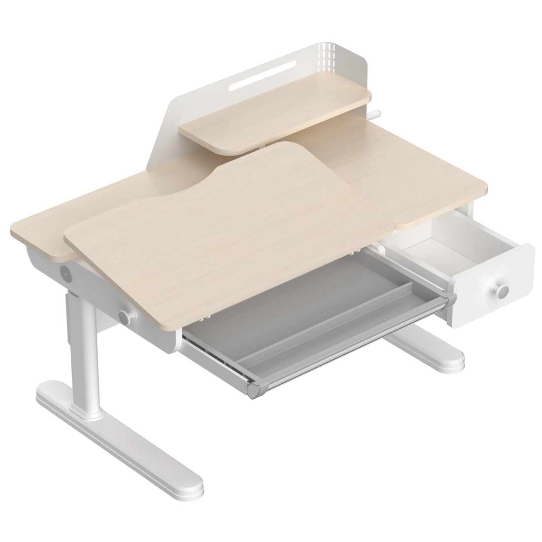 Wysuwana szuflada ułatwia przechowywanie zeszytów, notatek i drobnych przyborów szkolnych. Dzięki temu dziecko ma potrzebne rzeczy blisko, a na blacie zostaje więcej miejsca do pracy.