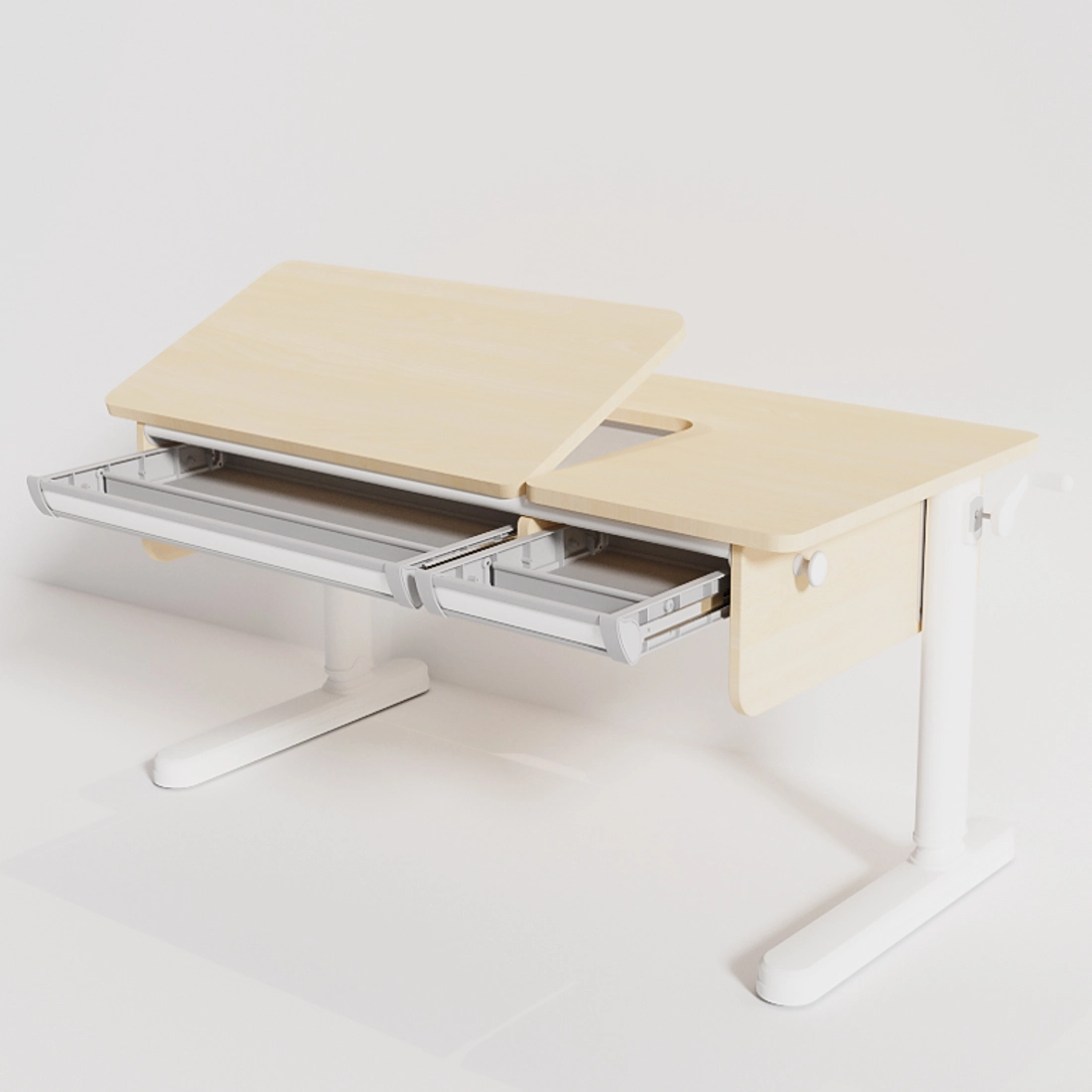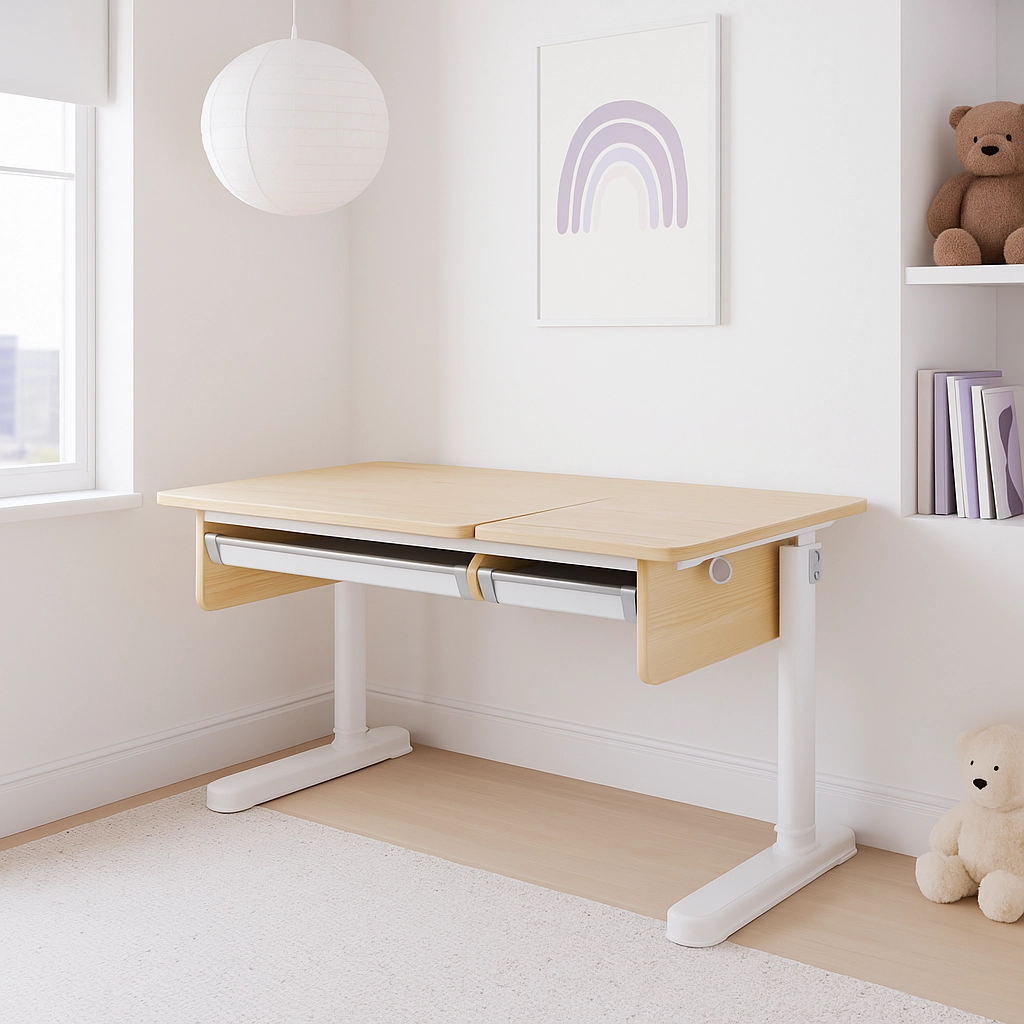 Biurko dziecięce z regulacją wysokości i kąta nachylenia blatu, wyposażone w dwuczęściowy blat z blokadą, przemyślane szuflady z przegródkami oraz stabilną konstrukcję z antypoślizgowymi stopkami. Idealne do nauki, rysowania i codziennego użycia.