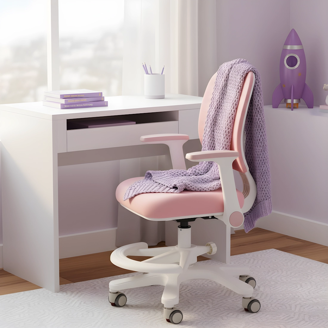 Zaawansowana regulacja wysokości pozwala dopasować krzesło do wzrostu dziecka i biurka. Stabilna podstawa posiada