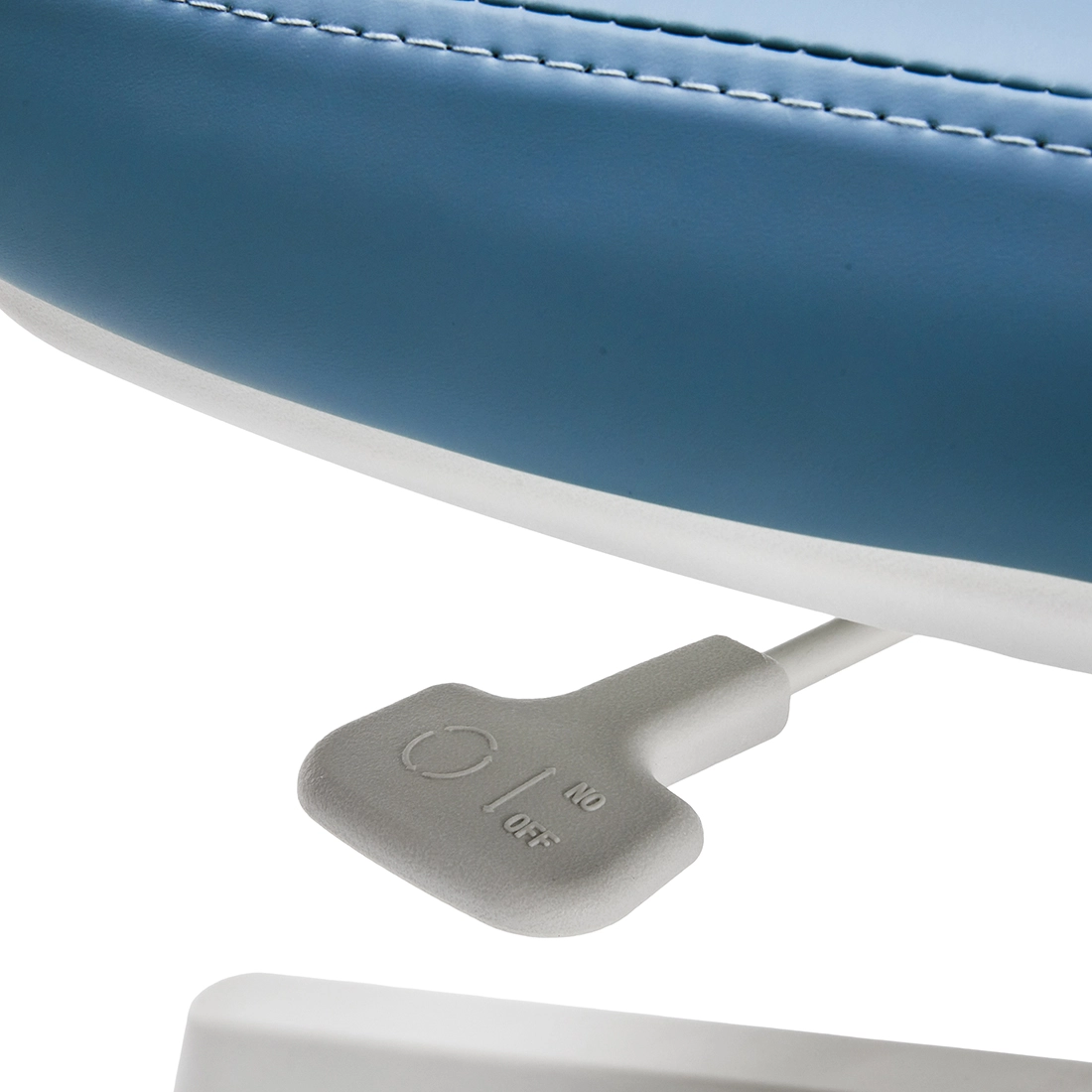 Krzesło jest wyposażone w stabilną podstawę oraz specjalne kółka grawitacyjne, które automatycznie blokują się, gdy dziecko na nim siedzi, zapobiegając niekontrolowanemu przesuwaniu. Dodatkowo, mechanizm obrotu siedziska posiada funkcję blokady.