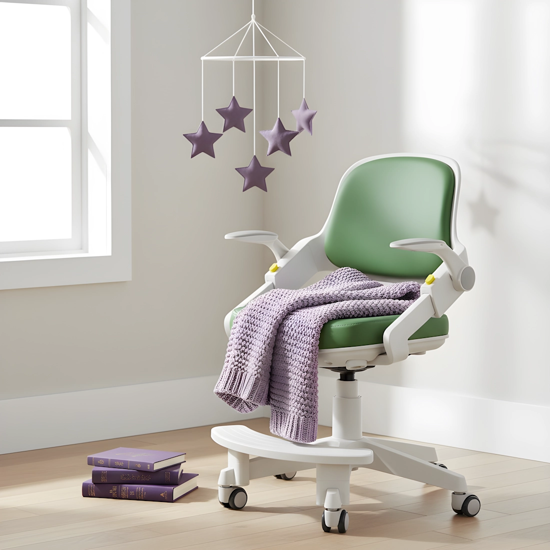 Wszystkie elementy wykonano z trwałych i bezpiecznych materiałów - od oparcia, przez solidną podstawę i ramę z wysokiej jakości tworzywa sztucznego. Zaokrąglone krawędzie, mobilne kółka i wygodny podnóżek chronią Twoje dziecko podczas codziennego użytkowania.