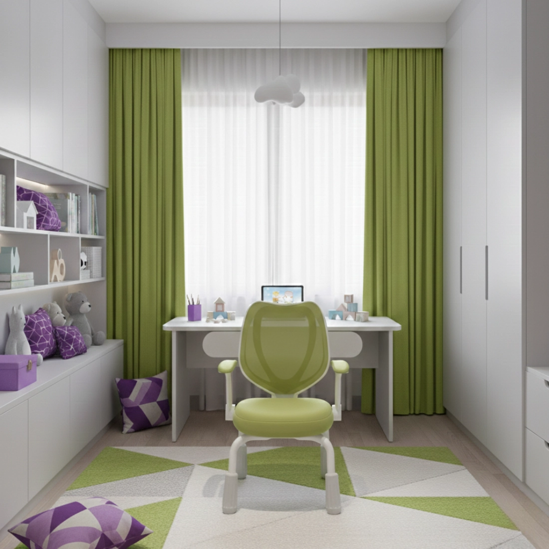 Zielone wykończenie dodaje wnętrzu świeżości i dobrze pasuje do dziecięcych aranżacji. To dobry wybór, jeśli chcesz wyróżnić stanowisko do nauki kolorem, ale nadal zachować praktyczną funkcjonalność krzesła.