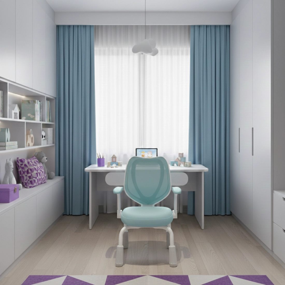 Niebieskie wykończenie dobrze pasuje do dziecięcych wnętrz i dodaje stanowisku przy biurku przyjaznego charakteru. To kolor, który łatwo połączyć z jasnymi meblami i nowoczesnymi dodatkami.