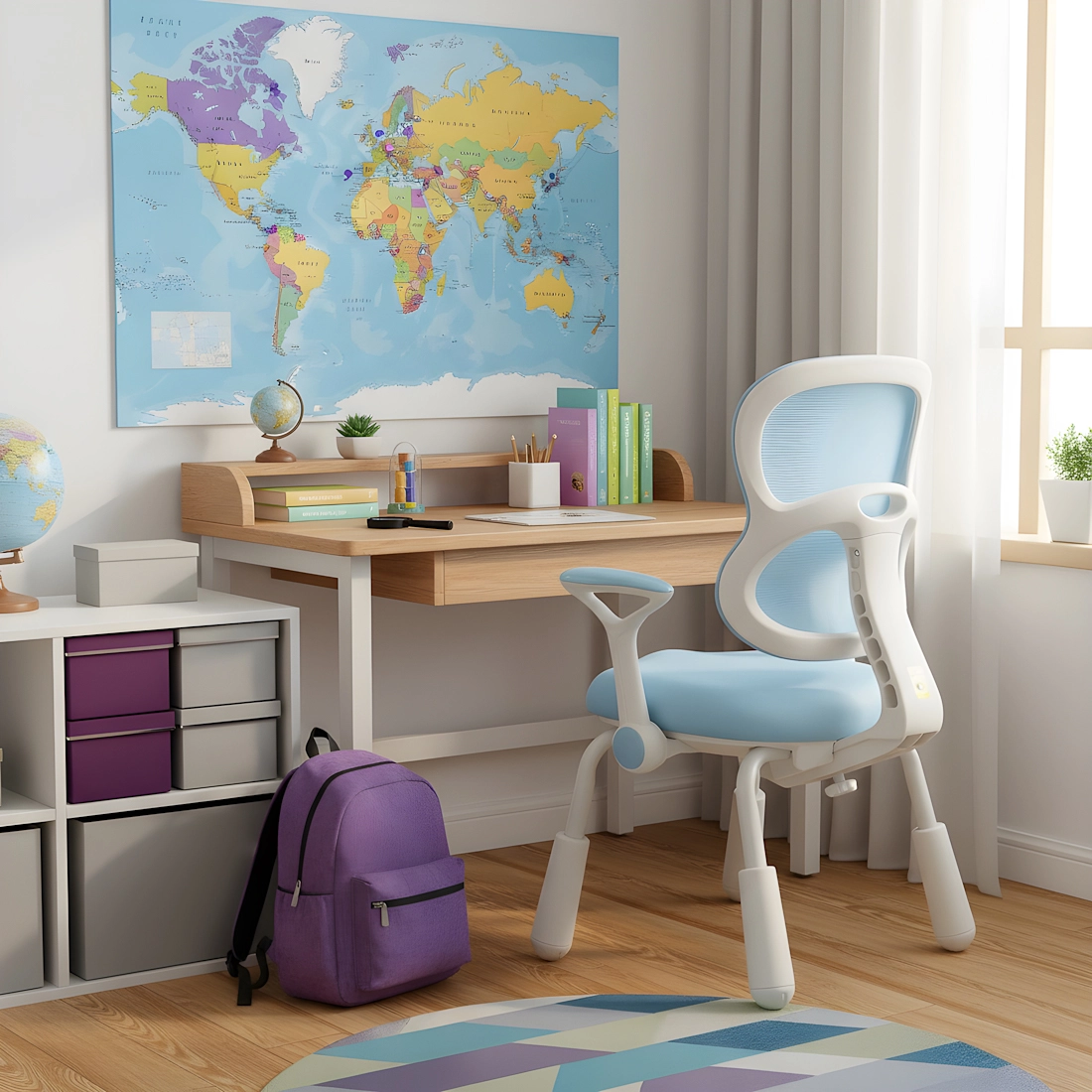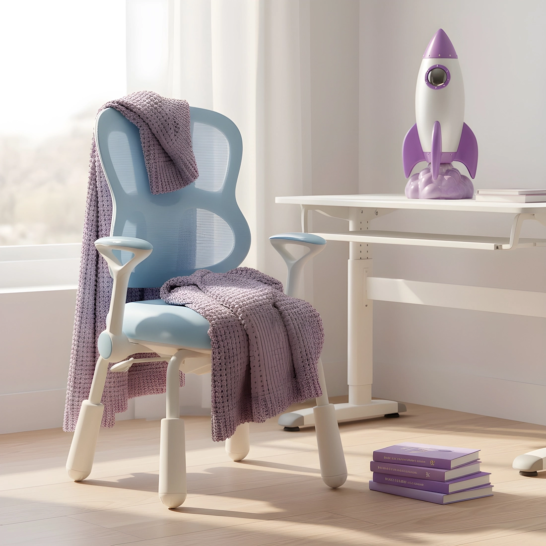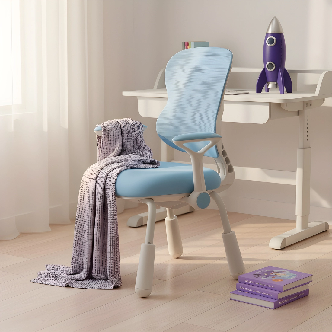 Pełna Regulacja Wysokości: Krzesło rośnie razem z dzieckiem, zapewniając prawidłowe ułożenie nóg i dopasowanie do biurka.