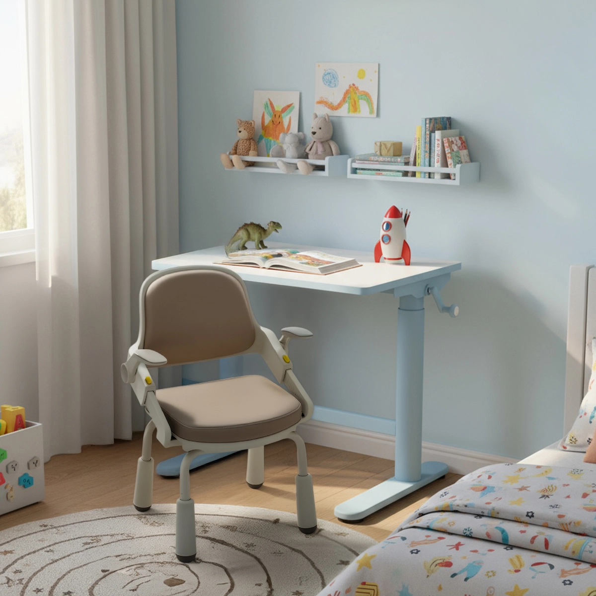 • Krzesło do biurka dla dzieci Spacetronik SPC-XD-10. Fotel dziecięcy został wyposażony w 4 regulowane nóżki, oparcie i siedzisko z podłokietnikami 2D. Ergonomiczny wybór do nauki i zabawy. Kolor szary regulowana wysokość 76-87 cm.
