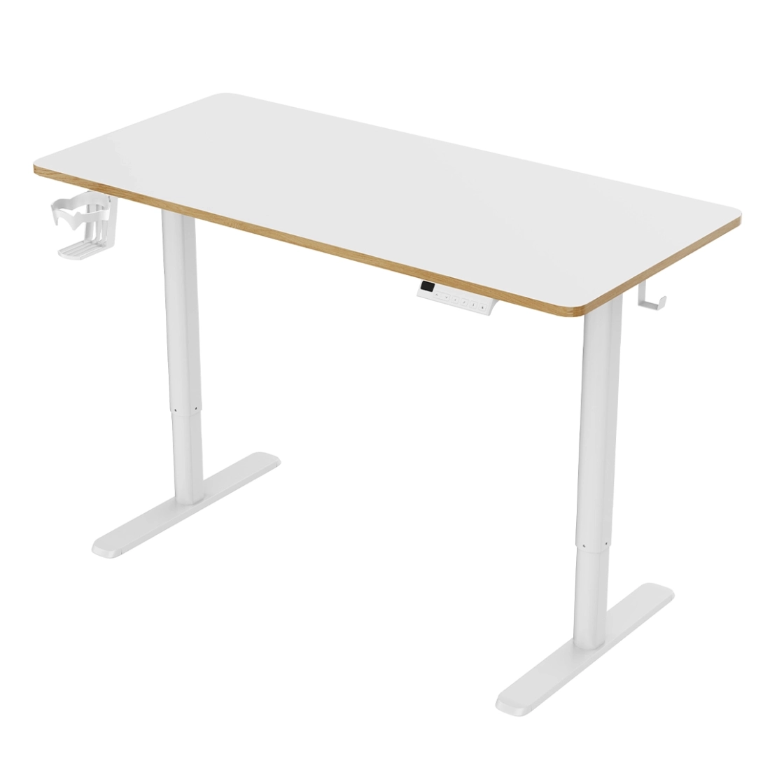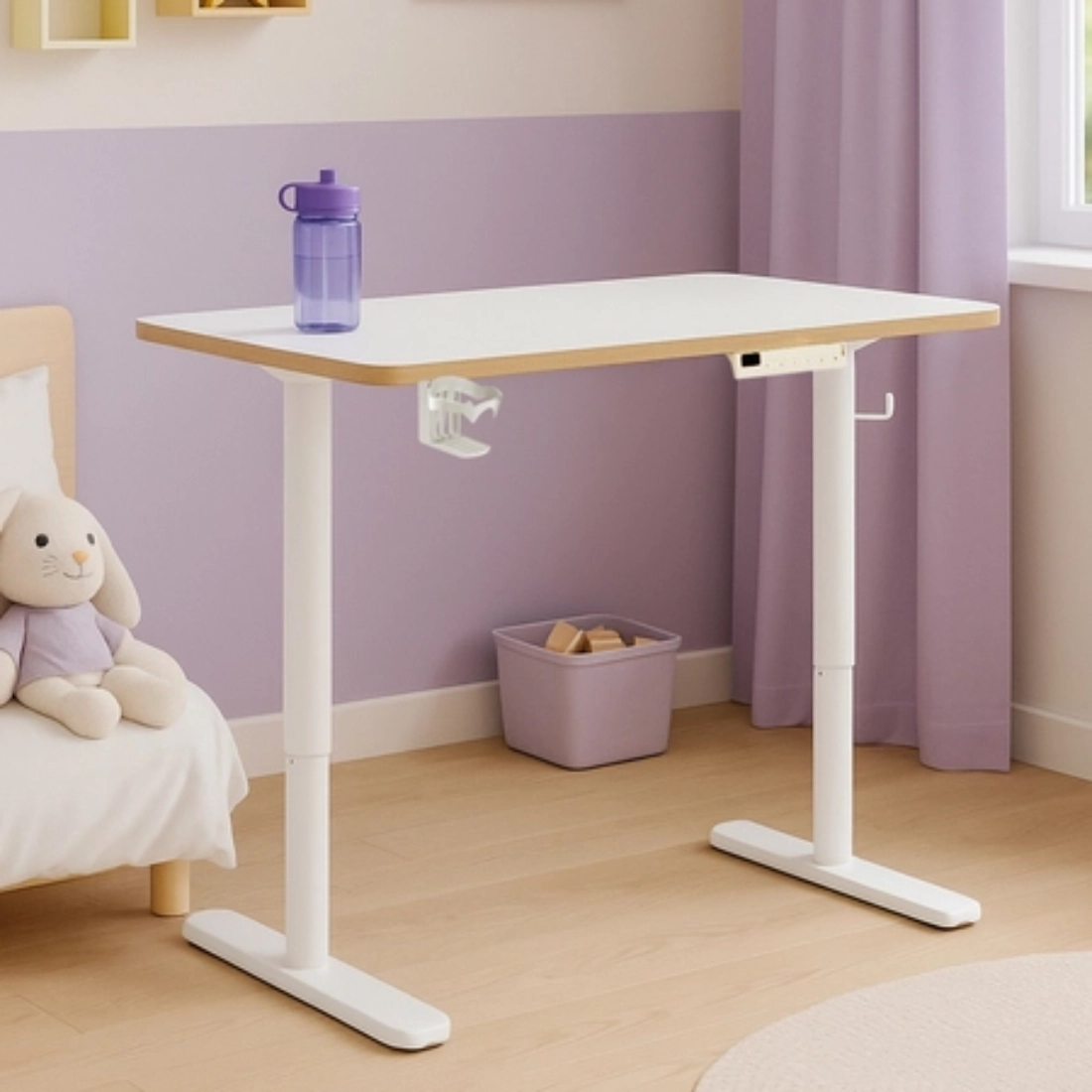 Panel sterujący z wyświetlaczem LED umożliwia zapisanie trzech ulubionych wysokości, a blokada dziecięca zapobiega przypadkowej zmianie ustawień. Blat o wymiarach 1100 × 520 mm z zaokrąglonymi krawędziami R30 oraz owalna, stalowa kolumna zwiększają bezpieczeństwo w pokoju dziecka i nadają biurku nowoczesny wygląd.
