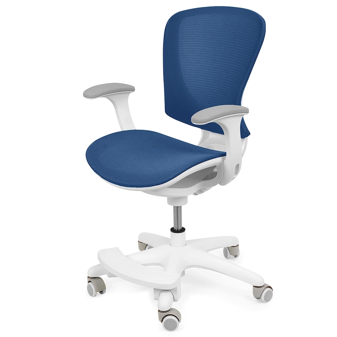 Krzesło ma ergonomicznie wyprofilowane oparcie i siedzisko z przewiewnej siatki nylonowej. Dodatkowo, kółka grawitacyjne blokują się automatycznie, gdy dziecko siada, zapewniając stabilność, a demontowany podnóżek wspiera prawidłowe ułożenie stóp.
