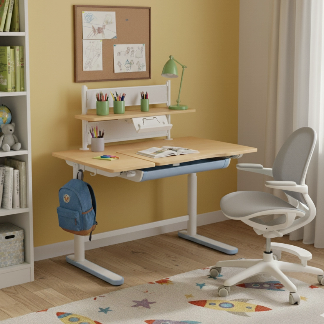 Po odrobieniu lekcji podlokietniki odchylane o 90° pozwalaja latwo wsunac krzeslo pod blat, oszczedzajac miejsce. Elektrycznie regulowane biurko 55–89 cm ulatwia dopasowanie wysokosci do dziecka, a dodatkowa pólka zwalnia przestrzen na blacie. Cicha praca napedu (<50 dB) nie rozprasza. Polaczenie bialo-niebieskiego biurka i krzesla pasuje do róznych aranzacji i wprowadza swiezy, nowoczesny charakter.