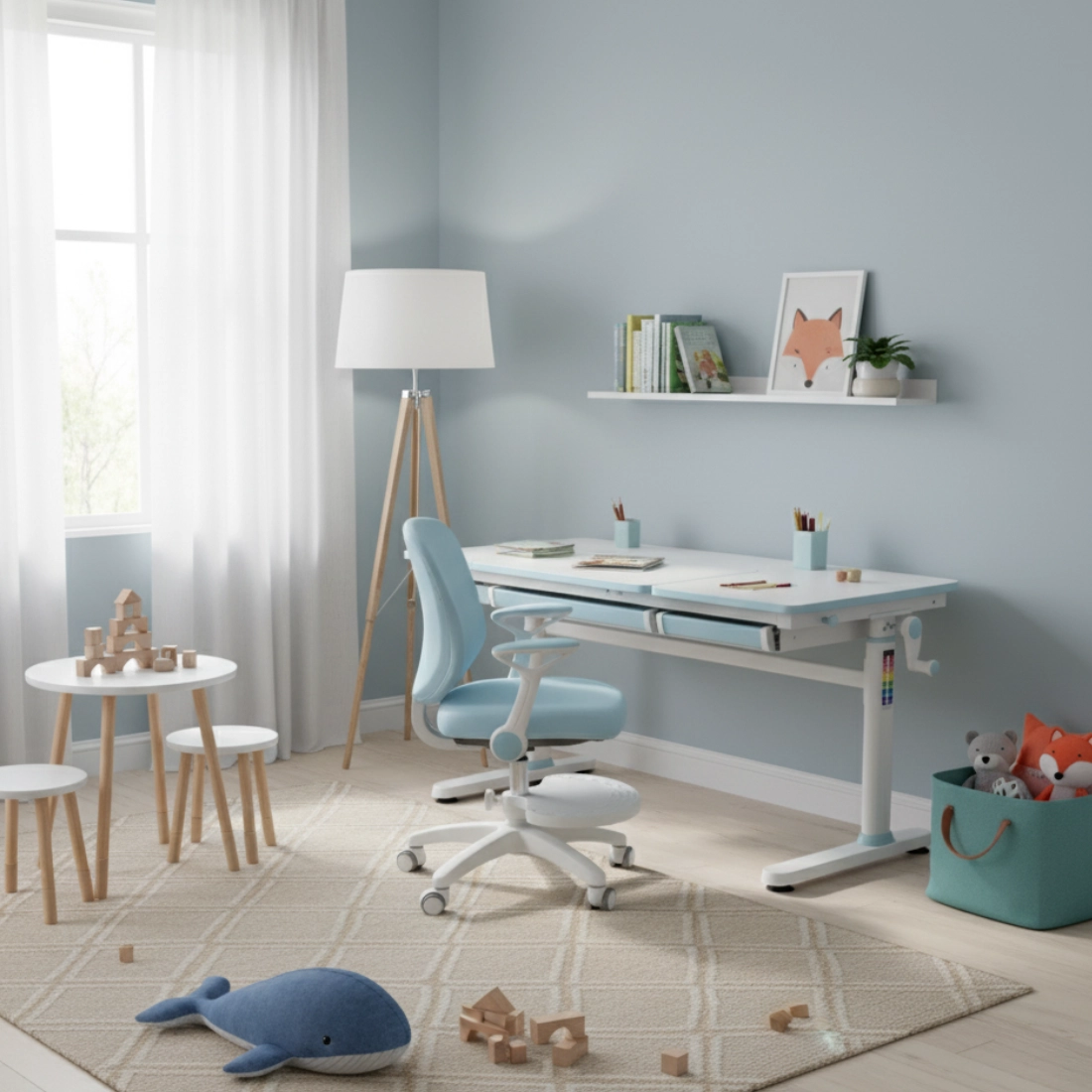 Kompletny zestaw do nauki i zabawy dla Twojego dziecka! W pakiecie otrzymujesz biurko z regulacją wysokości SPE-X104WA oraz ergonomiczne krzesło SPC-XD-17. Komplet rośnie wraz z dzieckiem (ok. 110–160 cm), wspiera prawidłową postawę, porządek i koncentrację. Neutralne biało-niebieskie biurko i niebieskie krzesło z przewiewną siatką pasują do większości aranżacji pokoju dziecięcego.