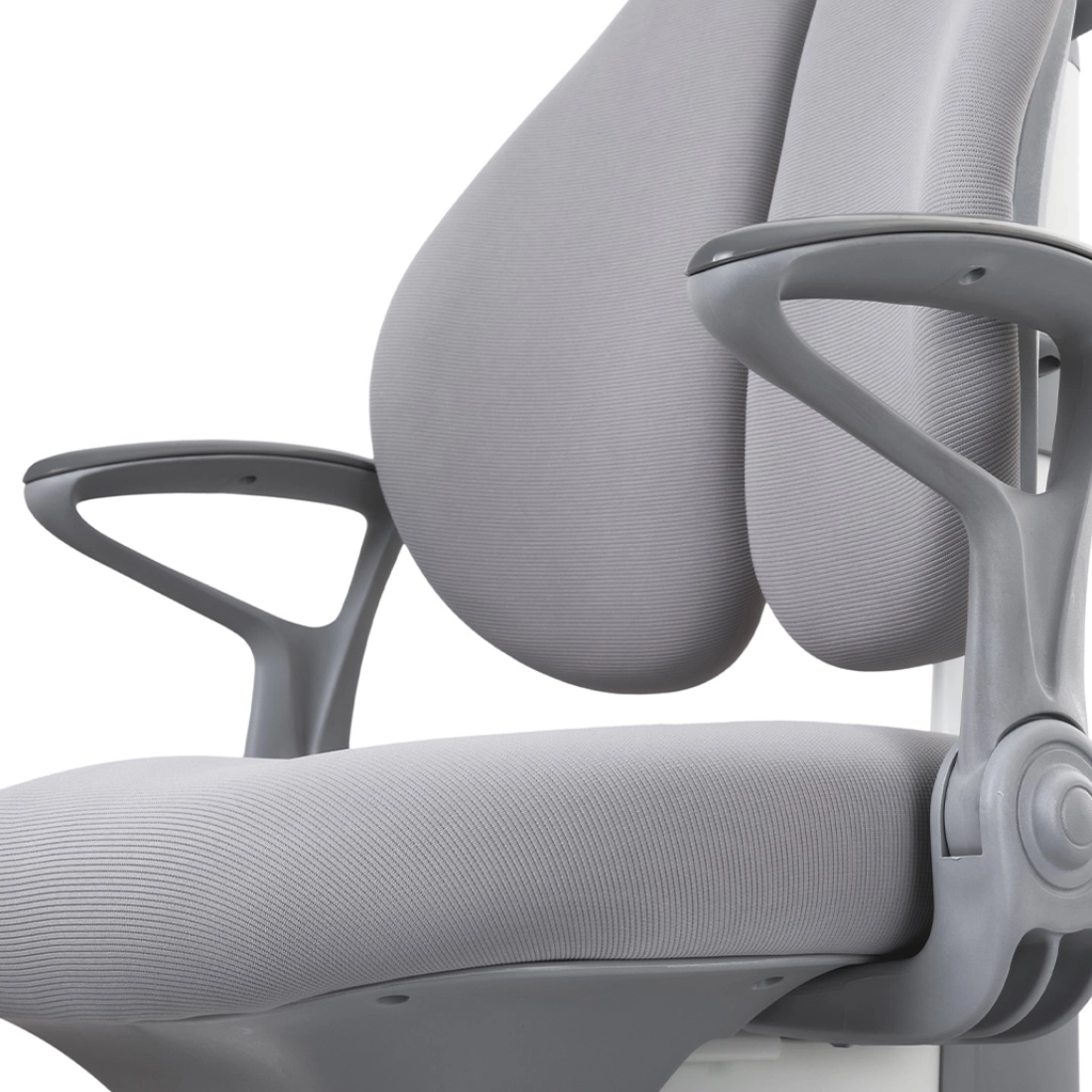 Po odrobieniu lekcji odchyl podlokietniki 90°, aby latwo wsunac krzeslo pod blat i zyskac miejsce. Polaczenie bialo-niebieskiego biurka i szarej tapicerki krzesla z biala podstawa wprowadza swiezy, nowoczesny charakter.