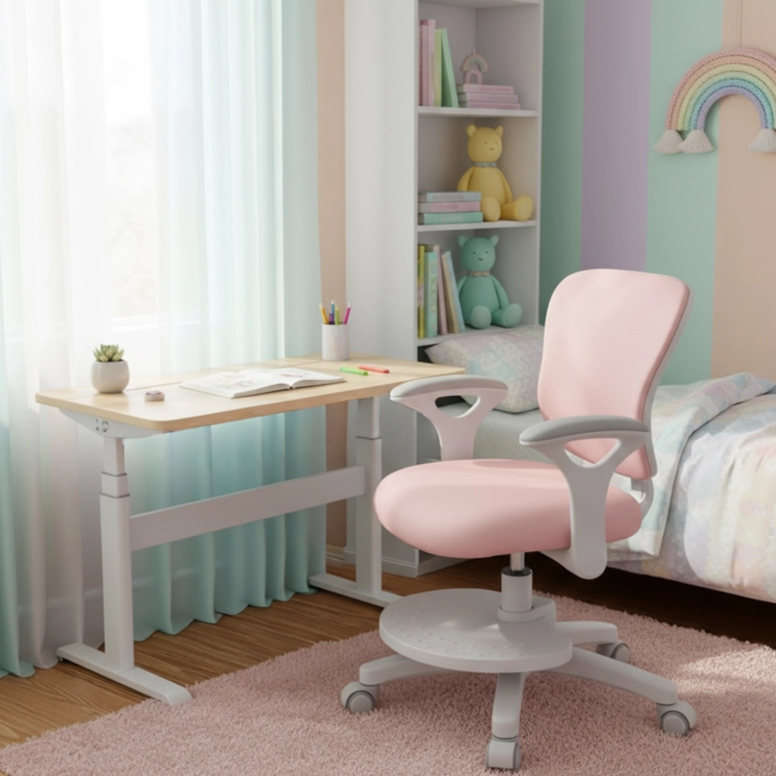 Kompletny zestaw do nauki i zabawy dla Twojego dziecka! W pakiecie otrzymujesz biurko z elektryczna regulacja wysokosci SPE-X112P oraz ergonomiczne krzeslo SPC-XD-17. Komplet rosnie wraz z dzieckiem (ok. 110–160 cm), wspiera prawidlowa postawe, porzadek i koncentracje. Bialo-rozowe biurko z blatem 100×50 cm i niebieskie krzeslo z przewiewna siatka pasuja do wiekszosci aranzacji pokoju dzieciecego.