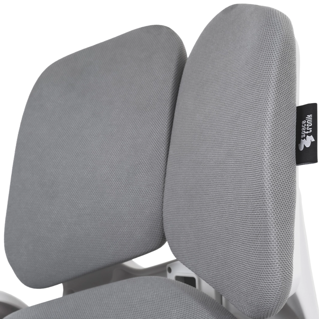 Spacetronik SPC-XD-07 dopasowuje sie do wzrostu dziecka (ok. 110–180 cm). Plynna regulacja wysokosci siedziska 45–56 cm i regulacja glebokosci siedziska 8 cm ulatwiaja prawidlowe ustawienie katów. Potrójne oparcie (dwa segmenty górne + poduszka ledzwiowa o regulowanej glebokosci 28–40 cm) wspiera kregoslup. Regulowany, antyposlizgowy podnózek zapewnia wygodne podparcie stóp. Kolka grawitacyjne blokuja sie pod obciazeniem, a blokada obrotu pomaga utrzymac skupienie.