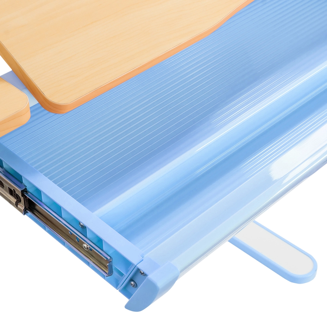 Kompletny zestaw do nauki i zabawy dla Twojego dziecka! W pakiecie otrzymujesz biurko z elektryczna regulacja wysokosci SPE-X116A (55–89 cm, blat 112 × 60 cm) z dodatkowa pólka i uchwytem na tablet/ksiazke oraz ergonomiczne krzeslo SPC-XD-06 z siatkowym, regulowanym oparciem, gazowa regulacja wysokosci siedziska 43–52 cm, regulowanym podnózkiem, podlokietnikami odchylanymi 90°, kólkami grawitacyjnymi (wl/wyl) i permanentna blokada obrotu (brak obrotu). Komplet rosnie wraz z dzieckiem (biurko ok. 120–160 cm, krzeslo ok. 110–180 cm), wspiera prawidlowa postawe, porzadek i koncentracje. Neutralne bialo-niebieskie biurko i krzeslo w tej samej kolorystyce pasuja do wiekszosci aranzacji pokoju dzieciecego.