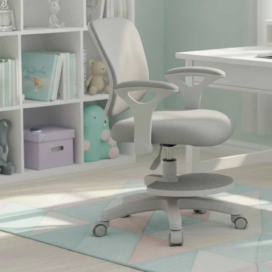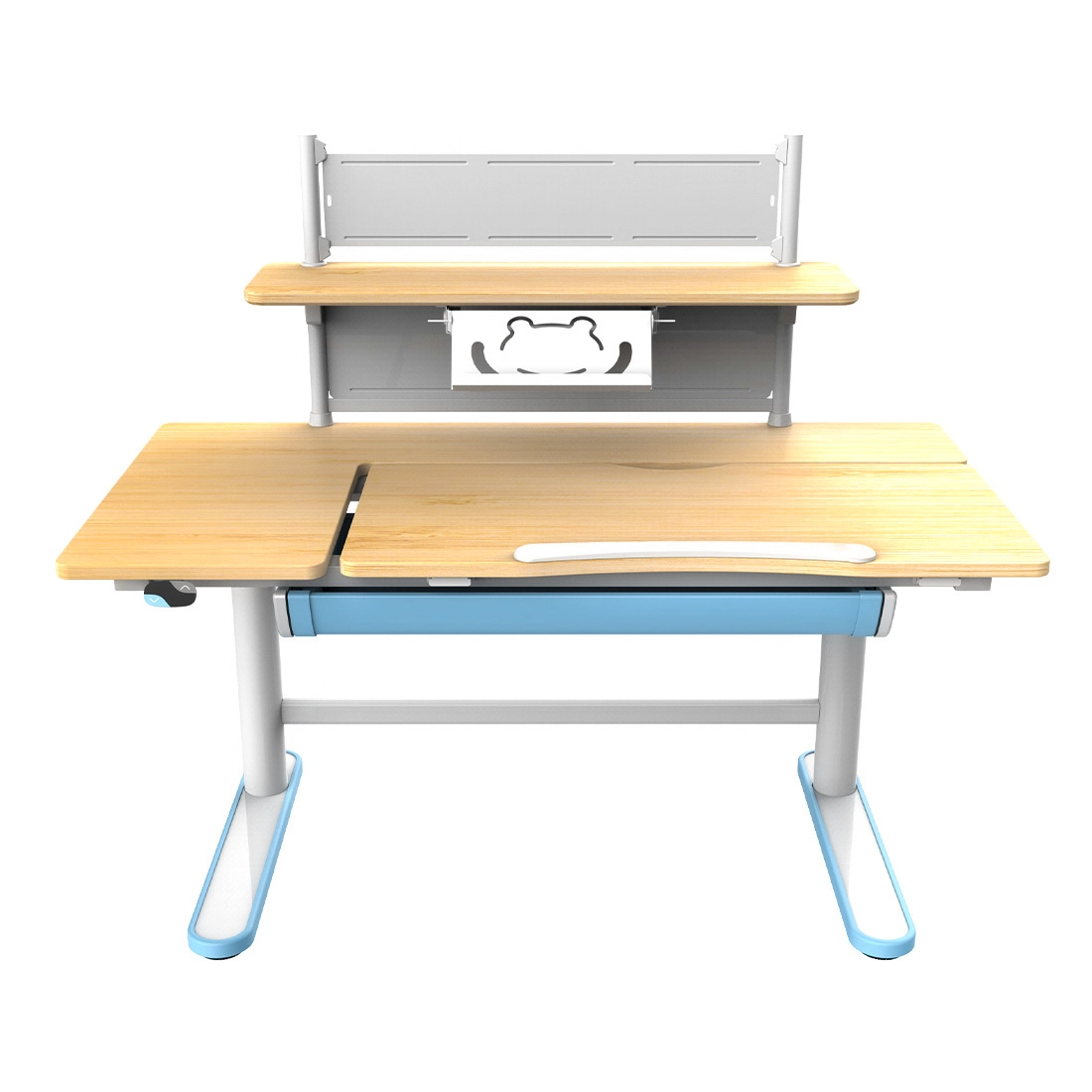 Po odrobieniu lekcji kompaktowa podstawa na kólkach pozwala latwo dosunac krzeslo pod blat, oszczedzajac miejsce. Elektrycznie regulowane biurko 55–89 cm ulatwia dopasowanie wysokosci do dziecka, a dodatkowa pólka zwalnia przestrzen na blacie. Cicha praca napedu (<50 dB) nie rozprasza. Polaczenie bialo-niebieskiego biurka i krzesla pasuje do róznych aranzacji i wprowadza swiezy, nowoczesny charakter.
