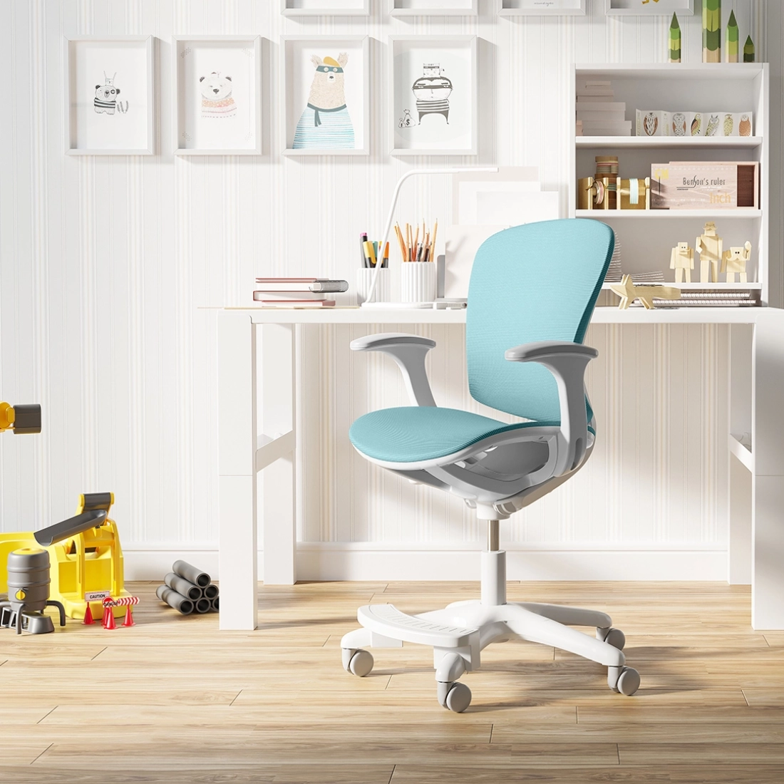 Uniwersalny design – Biało-niebieskie biurko + turkusowe krzesło tworzą świeży, przyjazny zestaw do nauki.
