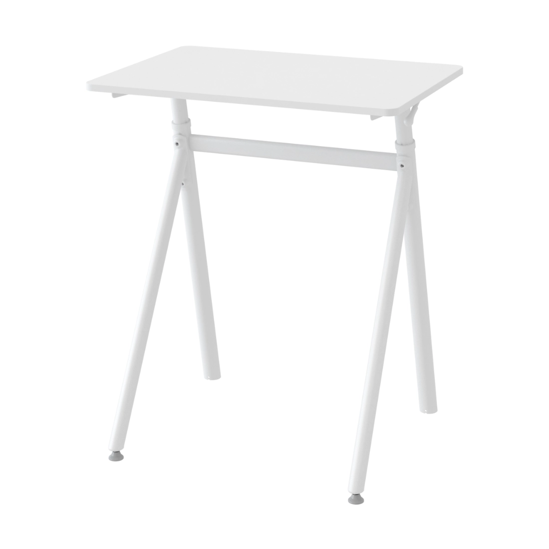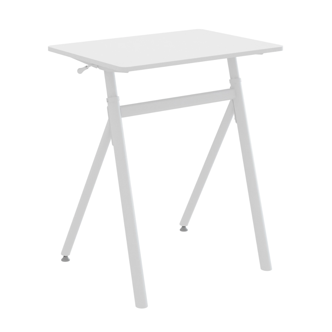 • Białe biurko stojące z płynną regulacją gazową w zakresie 71,6–105,2 cm obsługiwaną dźwignią pod blatem. Kompaktowy blat 70 × 50 cm oraz stabilna konstrukcja ze stali i PP z blatem z płyty wiórowej sprawdzą się do pracy i nauki.