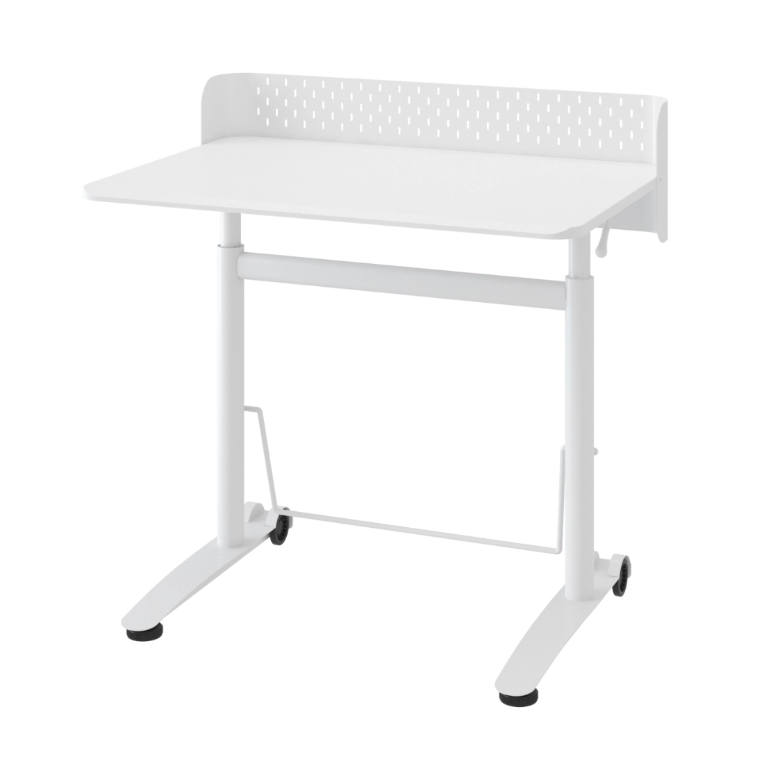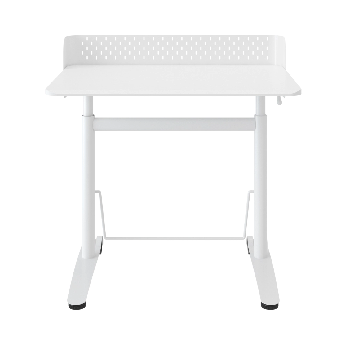 To białe stanowisko robocze ułatwia ustawienie wygodnej wysokości do pracy i nauki. Regulacja w zakresie 66,7–100,3 cm pozwala dopasować pozycję do potrzeb użytkownika, a większy blat 90 × 60 cm zapewnia więcej miejsca na sprzęt i akcesoria.